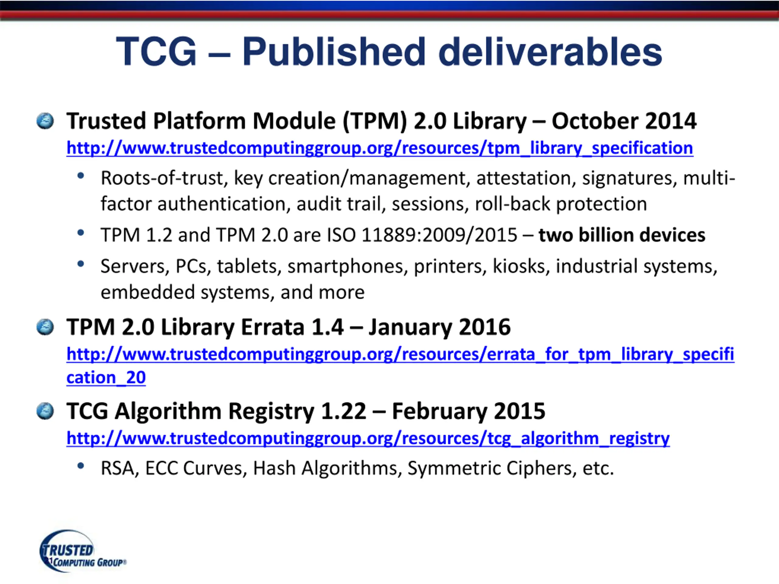 TCG Published deliverables Trusted Platform Module (TPM) 2.0 Library October 2014 http://www.trustedcomputinggroup.org/resources/tpm_library_specification Roots-of-trust, key creation/management, attestation, signatures, multi- factor authentication, audit trail, sessions, roll-back protection TPM 1.2 and TPM 2.0 are ISO 11889:2009/2015 two billion devices Servers, PCs, tablets, smartphones, printers, kiosks, industrial systems, embedded systems, and more TPM 2.0 Library Errata 1.4 January 2016 http://www.trustedcomputinggroup.org/resources/errata_for_tpm_library_specifi cation_20 TCG Algorithm Registry 1.22 February 2015 http://www.trustedcomputinggroup.org/resources/tcg_algorithm_registry RSA, ECC Curves, Hash Algorithms, Symmetric Ciphers, etc. 21