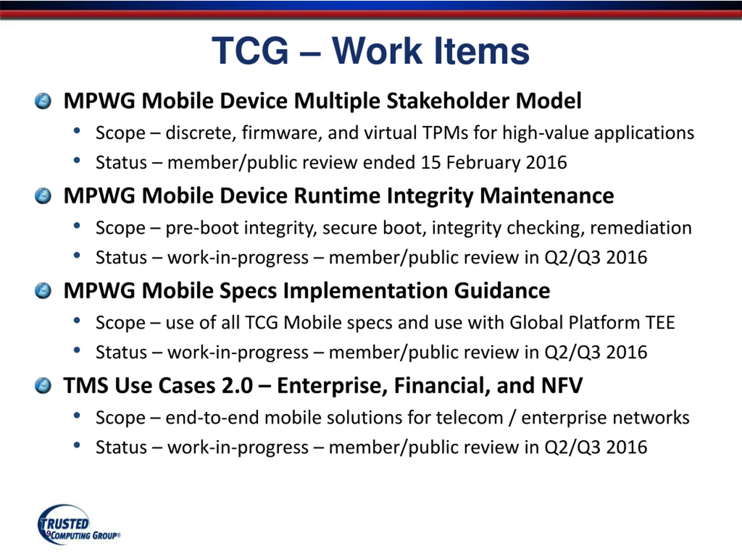 TCG Work Items MPWG Mobile Device Multiple Stakeholder Model Scope discrete, firmware, and virtual TPMs for high-value applications Status member/public review ended 15 February 2016 MPWG Mobile Device Runtime Integrity Maintenance Scope pre-boot integrity, secure boot, integrity checking, remediation Status work-in-progress member/public review in Q2/Q3 2016 MPWG Mobile Specs Implementation Guidance Scope use of all TCG Mobile specs and use with Global Platform TEE Status work-in-progress member/public review in Q2/Q3 2016 TMS Use Cases 2.0 Enterprise, Financial, and NFV Scope end-to-end mobile solutions for telecom / enterprise networks Status work-in-progress member/public review in Q2/Q3 2016 19