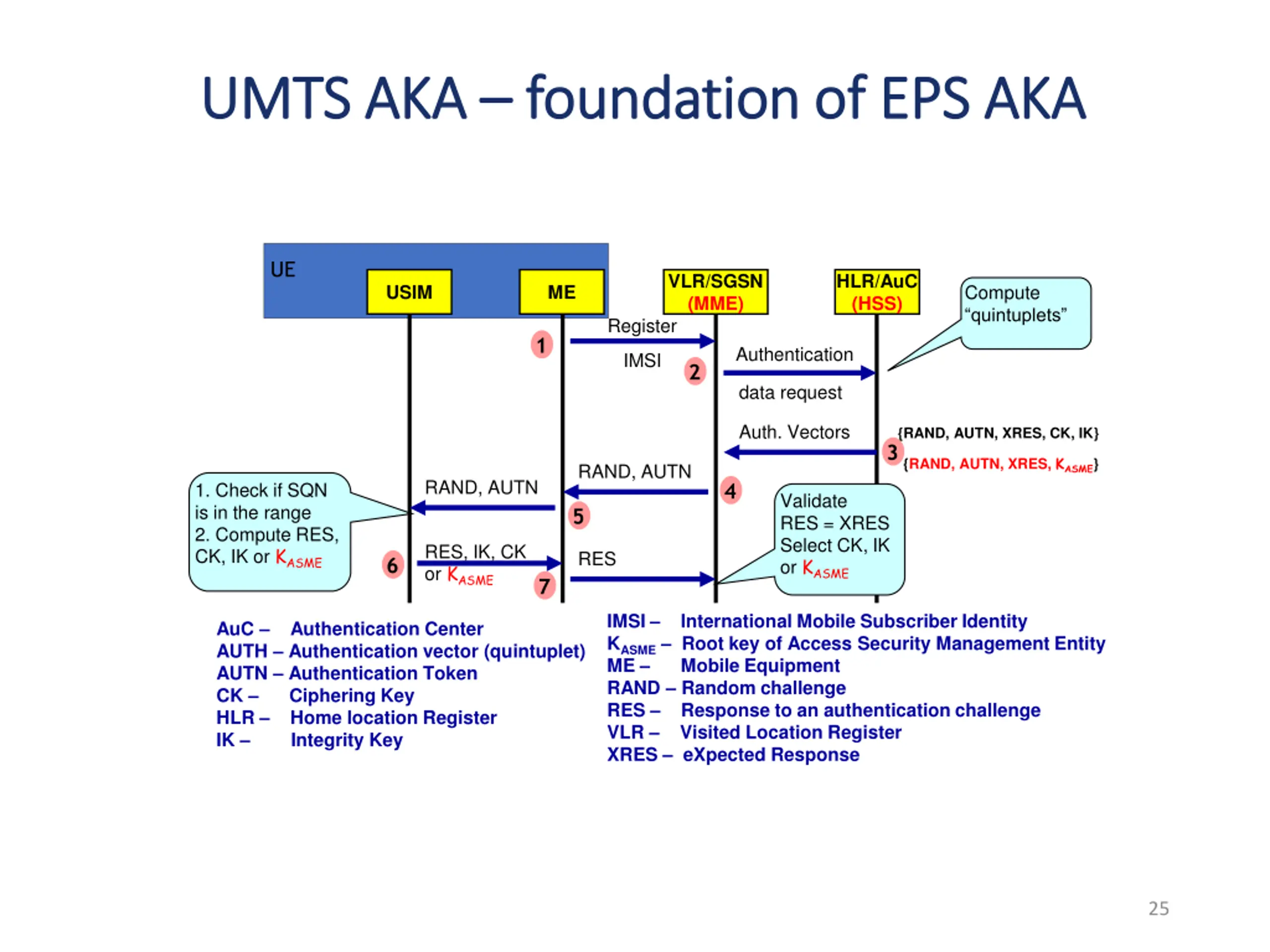 UMTS AKA UMTS AKA foundation of EPS AKA foundation of EPS AKA UE VLR/SGSN (MME) HLR/AuC (HSS) USIM ME Compute quintuplets Register 1 Authentication IMSI 2 data request Auth. Vectors {RAND, AUTN, XRES, CK, IK} 3 {RAND, AUTN, XRES, KASME} RAND, AUTN RAND, AUTN 4 1. Check if SQN is in the range 2. Compute RES, CK, IK or KASME Validate RES = XRES Select CK, IK or KASME 5 RES, IK, CK or KASME RES 6 7 IMSI International Mobile Subscriber Identity KASME Root key of Access Security Management Entity ME Mobile Equipment RAND Random challenge RES Response to an authentication challenge VLR Visited Location Register XRES eXpected Response AuC Authentication Center AUTH Authentication vector (quintuplet) AUTN Authentication Token CK Ciphering Key HLR Home location Register IK Integrity Key 25