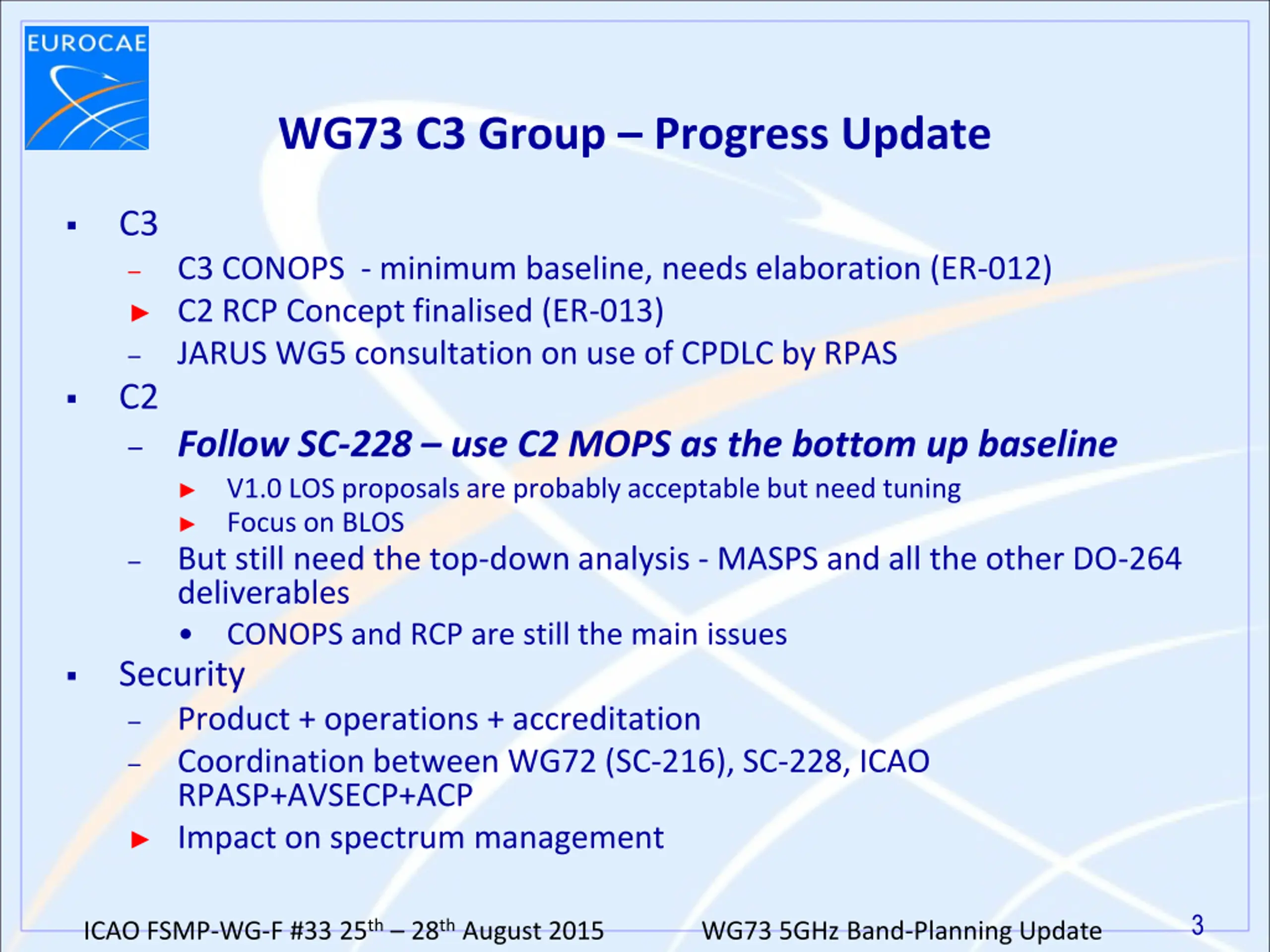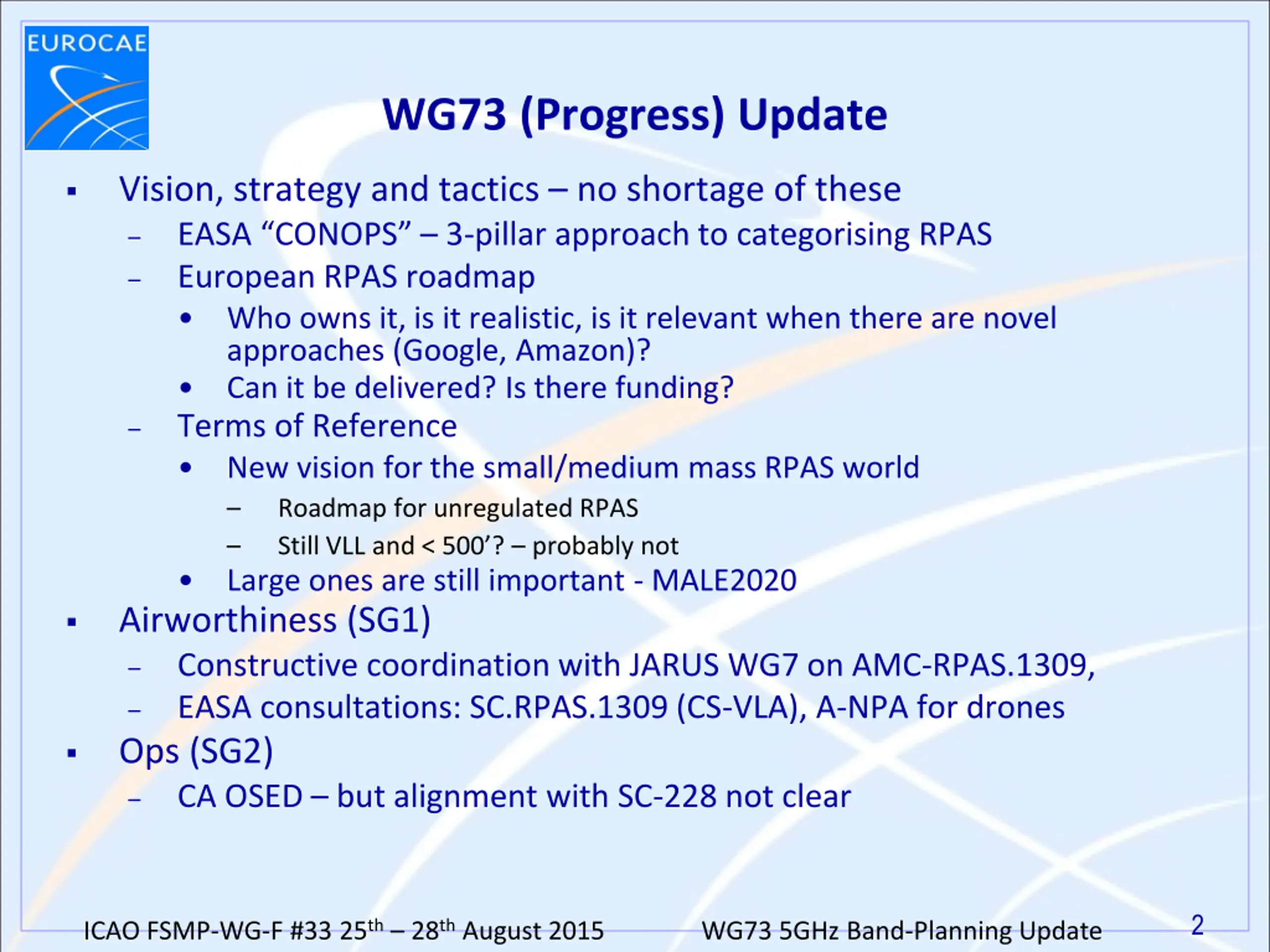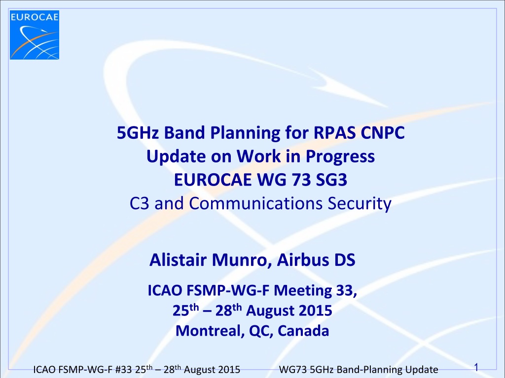 5GHz Band Planning for RPAS CNPC Update on Work in Progress EUROCAE WG 73 SG3 C3 and Communications Security Alistair Munro, Airbus DS ICAO FSMP-WG-F Meeting 33, 25th 28thAugust 2015 Montreal, QC, Canada 1 ICAO FSMP-WG-F #33 25th 28thAugust 2015 WG73 5GHz Band-Planning Update