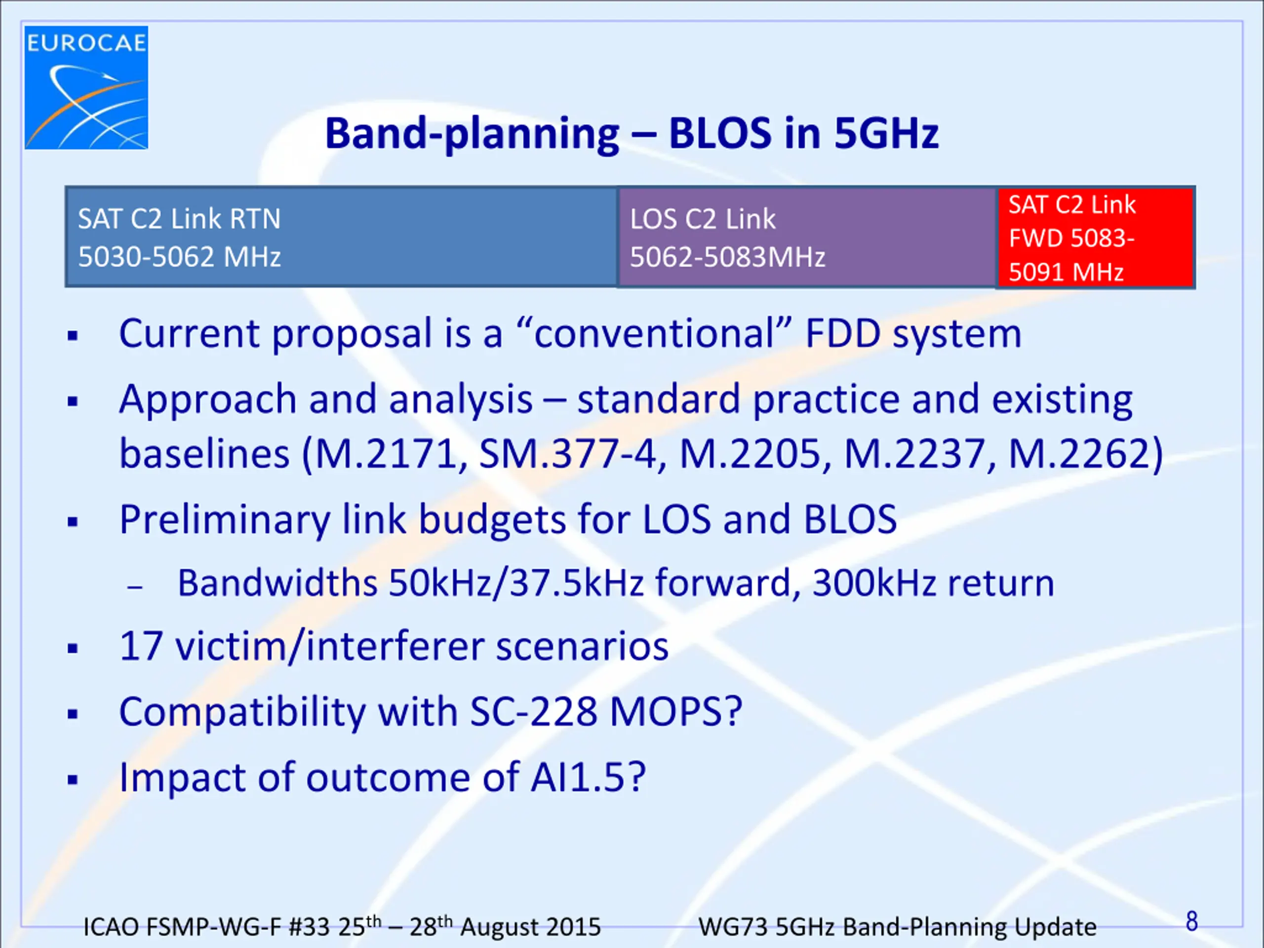 Band-planning BLOS in 5GHz SAT C2 Link FWD 5083- 5091 MHz SAT C2 Link RTN 5030-5062 MHz LOS C2 Link 5062-5083MHz Current proposal is a conventional FDD system Approach and analysis standard practice and existing baselines (M.2171, SM.377-4, M.2205, M.2237, M.2262) Preliminary link budgets for LOS and BLOS Bandwidths 50kHz/37.5kHz forward, 300kHz return 17 victim/interferer scenarios Compatibility with SC-228 MOPS? Impact of outcome of AI1.5? 8 ICAO FSMP-WG-F #33 25th 28thAugust 2015 WG73 5GHz Band-Planning Update