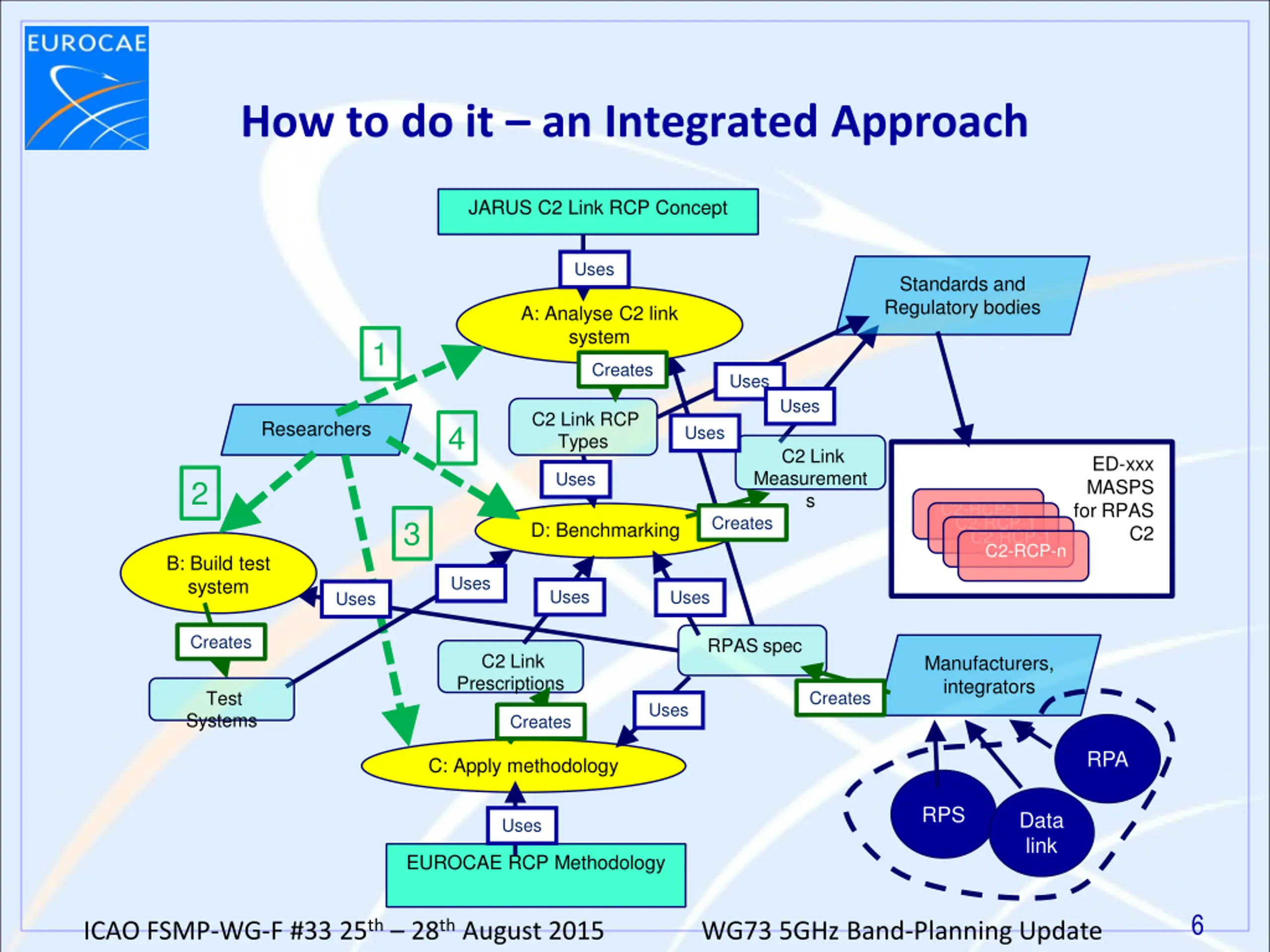 How to do it an Integrated Approach JARUS C2 Link RCP Concept Uses Standards and Regulatory bodies A: Analyse C2 link system 1 Creates Uses Uses C2 Link RCP Types Researchers 4 Uses C2 Link Measurement s Creates ED-xxx MASPS for RPAS Uses 2 C2-RCP-1 C2-RCP-1 C2-RCP-1 C2-RCP-n 3 D: Benchmarking C2 B: Build test system Uses Uses Uses Uses Creates RPAS spec C2 Link Prescriptions Manufacturers, integrators Test Systems Creates Uses Creates RPA C: Apply methodology RPS Data link Uses EUROCAE RCP Methodology 6 ICAO FSMP-WG-F #33 25th 28thAugust 2015 WG73 5GHz Band-Planning Update