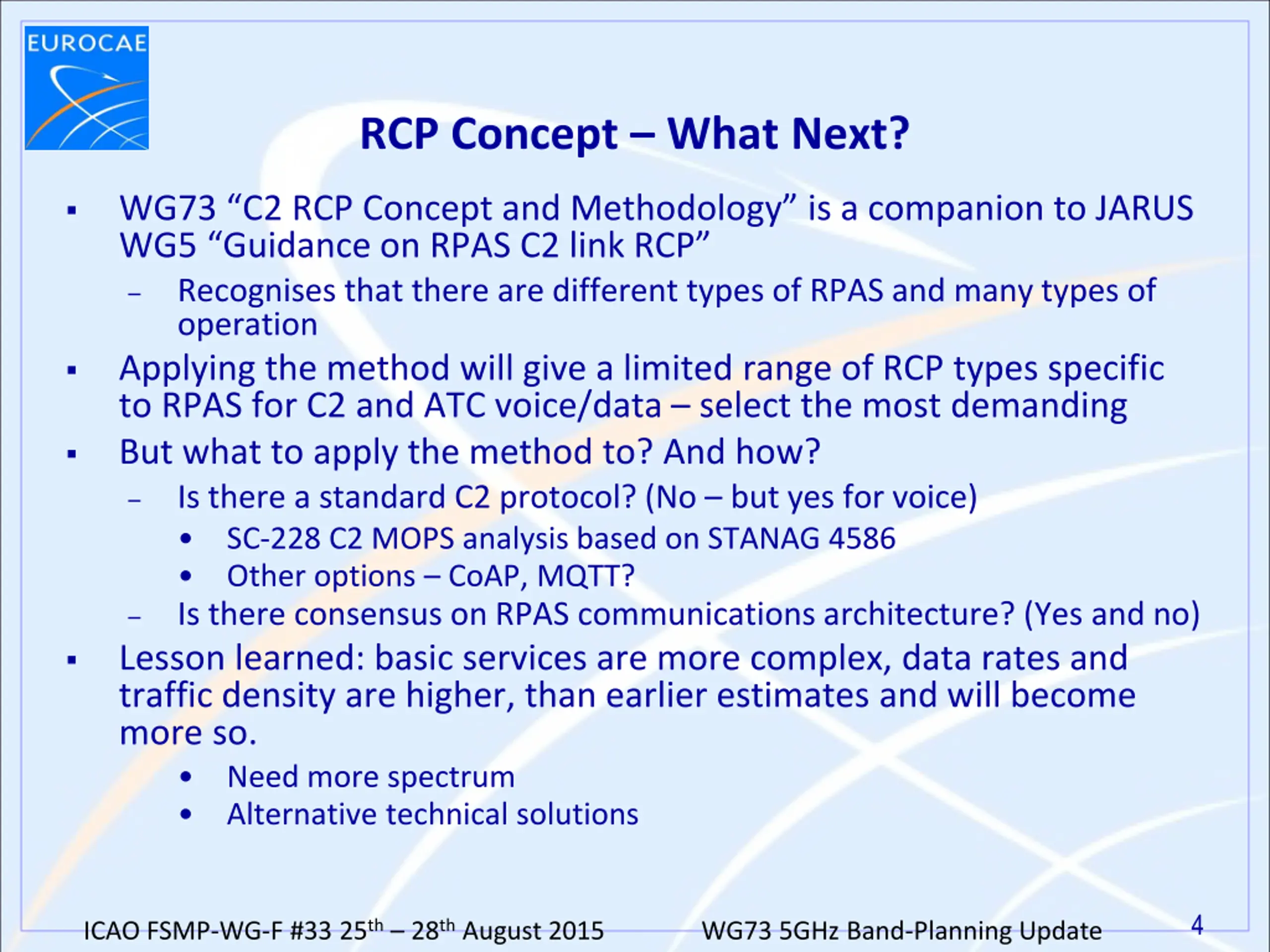 WG73 C3 Group Progress Update C3 C3 CONOPS - minimum baseline, needs elaboration (ER-012) C2 RCP Concept finalised (ER-013) JARUS WG5 consultation on use of CPDLC by RPAS C2 Follow SC-228 use C2 MOPS as the bottom up baseline V1.0 LOS proposals are probably acceptable but need tuning Focus on BLOS But still need the top-down analysis - MASPS and all the other DO-264 deliverables CONOPS and RCP are still the main issues Security Product + operations + accreditation Coordination between WG72 (SC-216), SC-228, ICAO RPASP+AVSECP+ACP Impact on spectrum management 3 ICAO FSMP-WG-F #33 25th 28thAugust 2015 WG73 5GHz Band-Planning Update