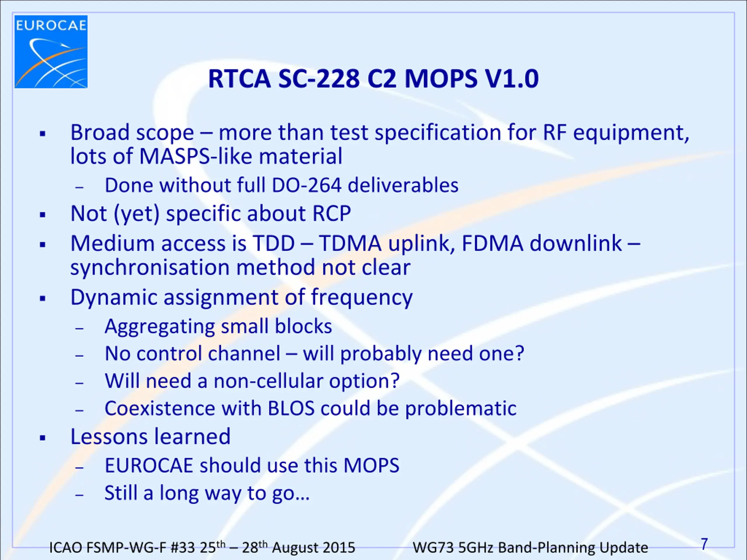 RTCA SC-228 C2 MOPS V1.0 Broad scope more than test specification for RF equipment, lots of MASPS-like material Done without full DO-264 deliverables Not (yet) specific about RCP Medium access is TDD TDMA uplink, FDMA downlink synchronisation method not clear Dynamic assignment of frequency Aggregating small blocks No control channel will probably need one? Will need a non-cellular option? Coexistence with BLOS could be problematic Lessons learned EUROCAE should use this MOPS Still a long way to go 7 ICAO FSMP-WG-F #33 25th 28thAugust 2015 WG73 5GHz Band-Planning Update