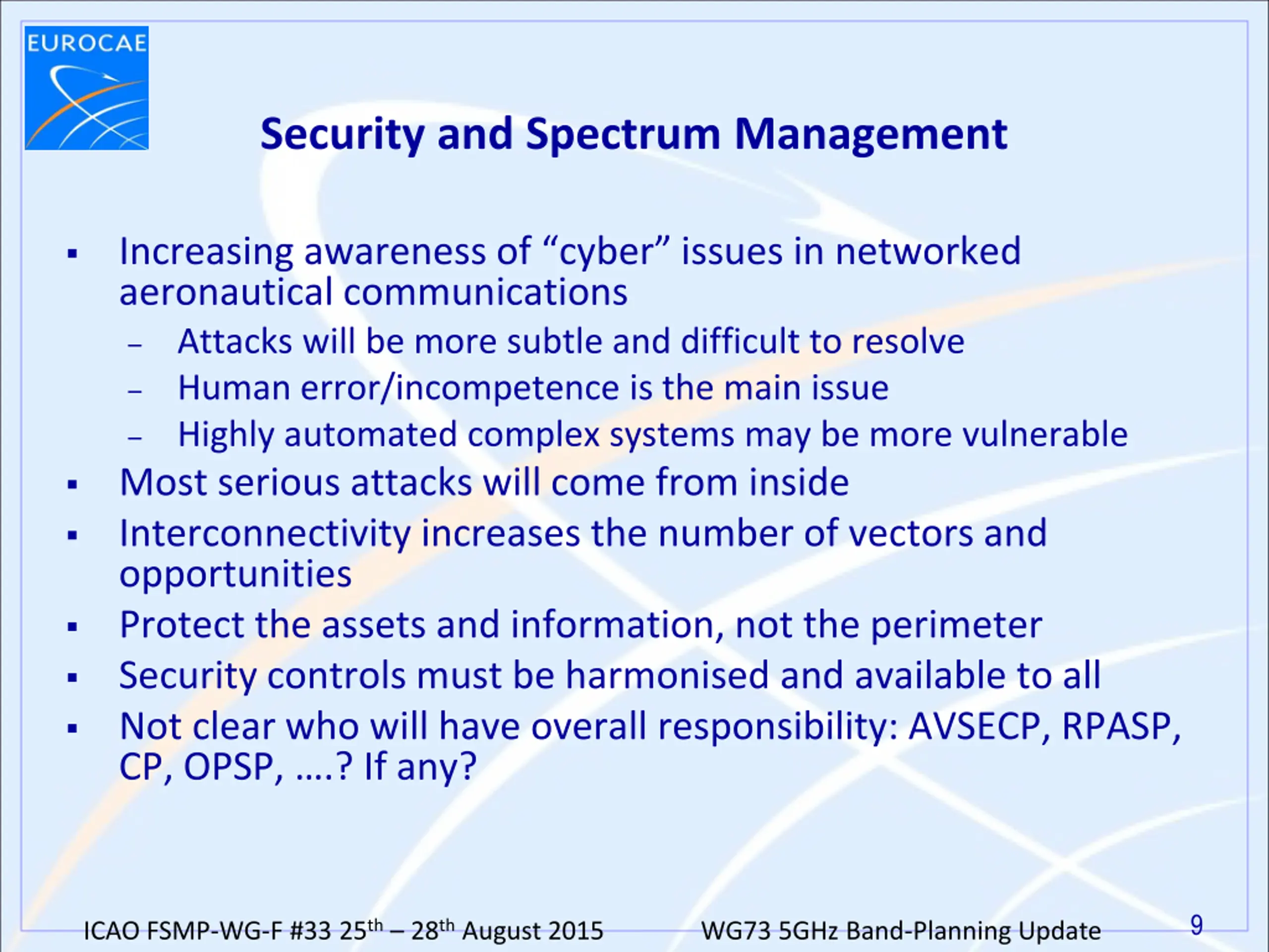 Security and Spectrum Management Increasing awareness of cyber issues in networked aeronautical communications Attacks will be more subtle and difficult to resolve Human error/incompetence is the main issue Highly automated complex systems may be more vulnerable Most serious attacks will come from inside Interconnectivity increases the number of vectors and opportunities Protect the assets and information, not the perimeter Security controls must be harmonised and available to all Not clear who will have overall responsibility: AVSECP, RPASP, CP, OPSP, .? If any? 9 ICAO FSMP-WG-F #33 25th 28thAugust 2015 WG73 5GHz Band-Planning Update