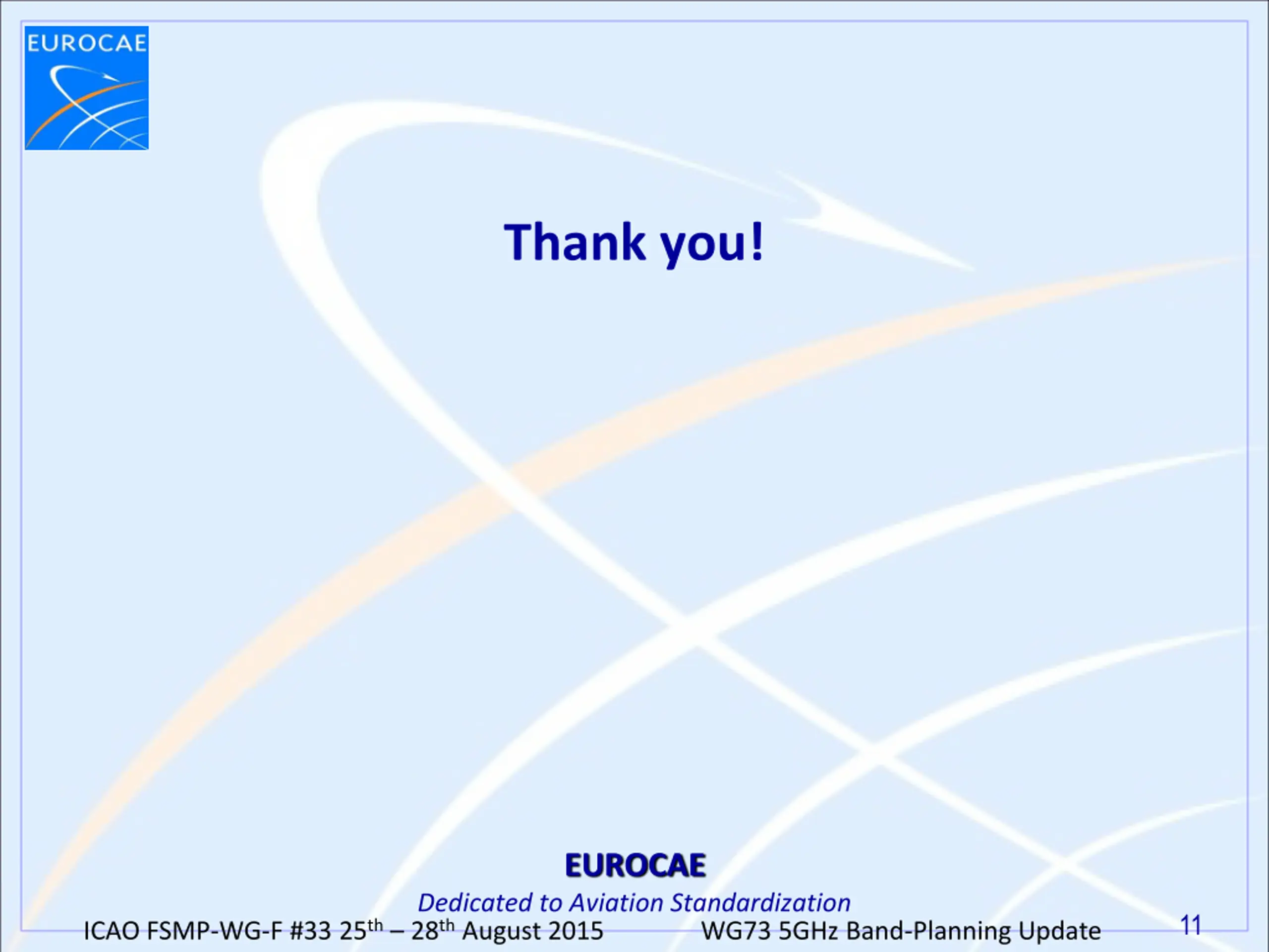 Thank you! EUROCAE Dedicated to Aviation Standardization 11 ICAO FSMP-WG-F #33 25th 28thAugust 2015 WG73 5GHz Band-Planning Update