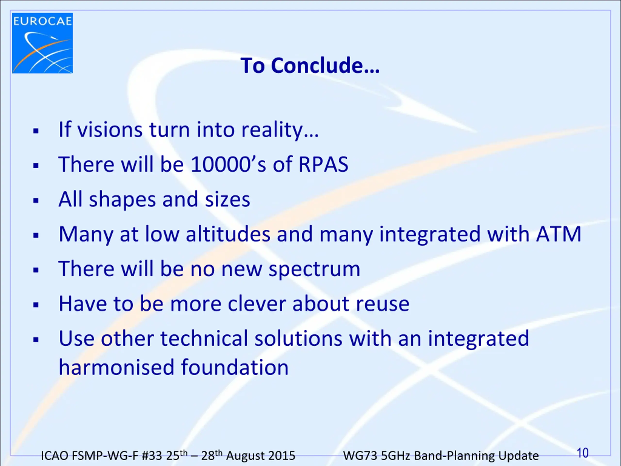 To Conclude If visions turn into reality There will be 10000 s of RPAS All shapes and sizes Many at low altitudes and many integrated with ATM There will be no new spectrum Have to be more clever about reuse Use other technical solutions with an integrated harmonised foundation 10 ICAO FSMP-WG-F #33 25th 28thAugust 2015 WG73 5GHz Band-Planning Update