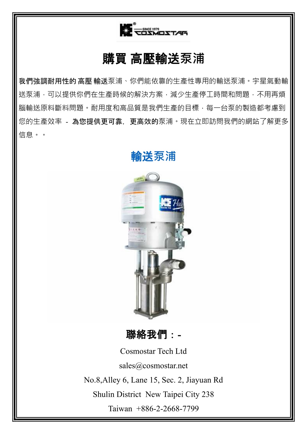 u6211u5011u5f37u8abfu8010u7528u6027u7684 u9ad8u58d3 u8f38u9001u6cf5u6d66u3001u4f60u5011u80fdu4f9du9760u7684u751fu7522u6027u5c08u7528u7684u8f38u9001u6cf5u6d66u3002u5b87u661fu6c23u52d5u8f38u9001u6cf5u6d66uff0cu