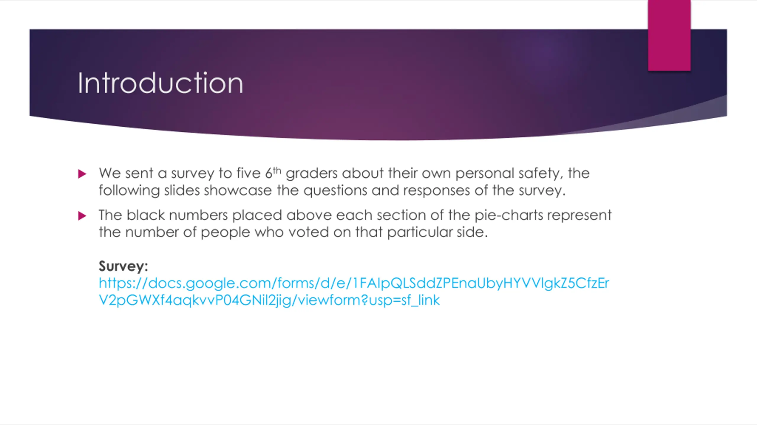 Introduction We sent a survey to five 6thgraders about their own personal safety, the following slides showcase the questions and responses of the survey. The black numbers placed above each section of the pie-charts represent the number of people who voted on that particular side. Survey: https://docs.google.com/forms/d/e/1FAIpQLSddZPEnaUbyHYVVlgkZ5CfzEr V2pGWXf4aqkvvP04GNil2jig/viewform?usp=sf_link