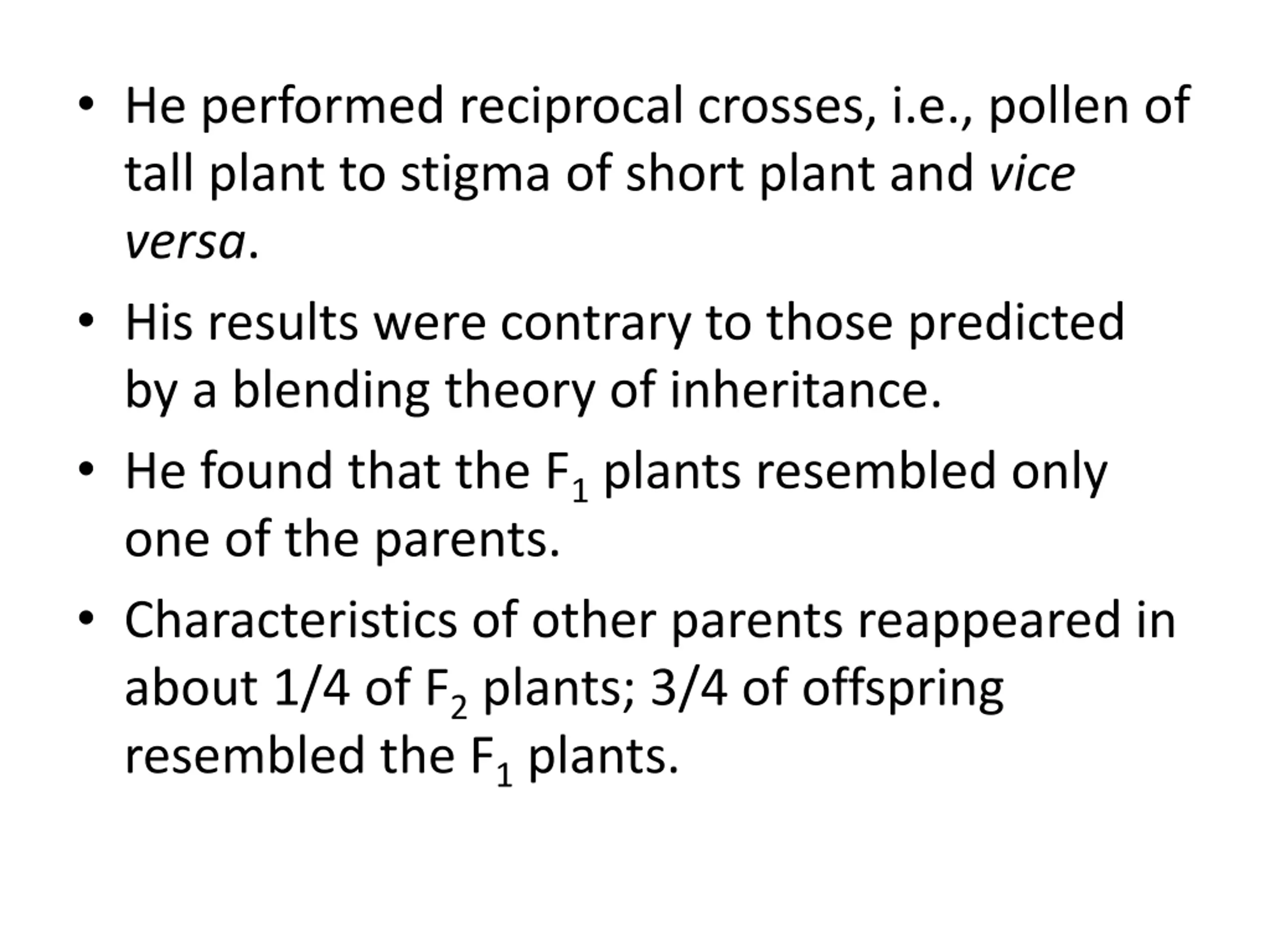 He performed reciprocal crosses, i.e., pollen of tall plant to stigma of short plant and vice versa. His results were contrary to those predicted by a blending theory of inheritance. He found that the F1plants resembled only one of the parents. Characteristics of other parents reappeared in about 1/4 of F2plants; 3/4 of offspring resembled the F1plants.