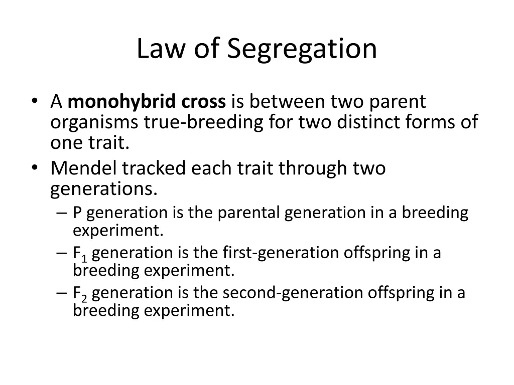 Law of Segregation A monohybrid cross is between two parent organisms true-breeding for two distinct forms of one trait. Mendel tracked each trait through two generations. P generation is the parental generation in a breeding experiment. F1generation is the first-generation offspring in a breeding experiment. F2generation is the second-generation offspring in a breeding experiment.