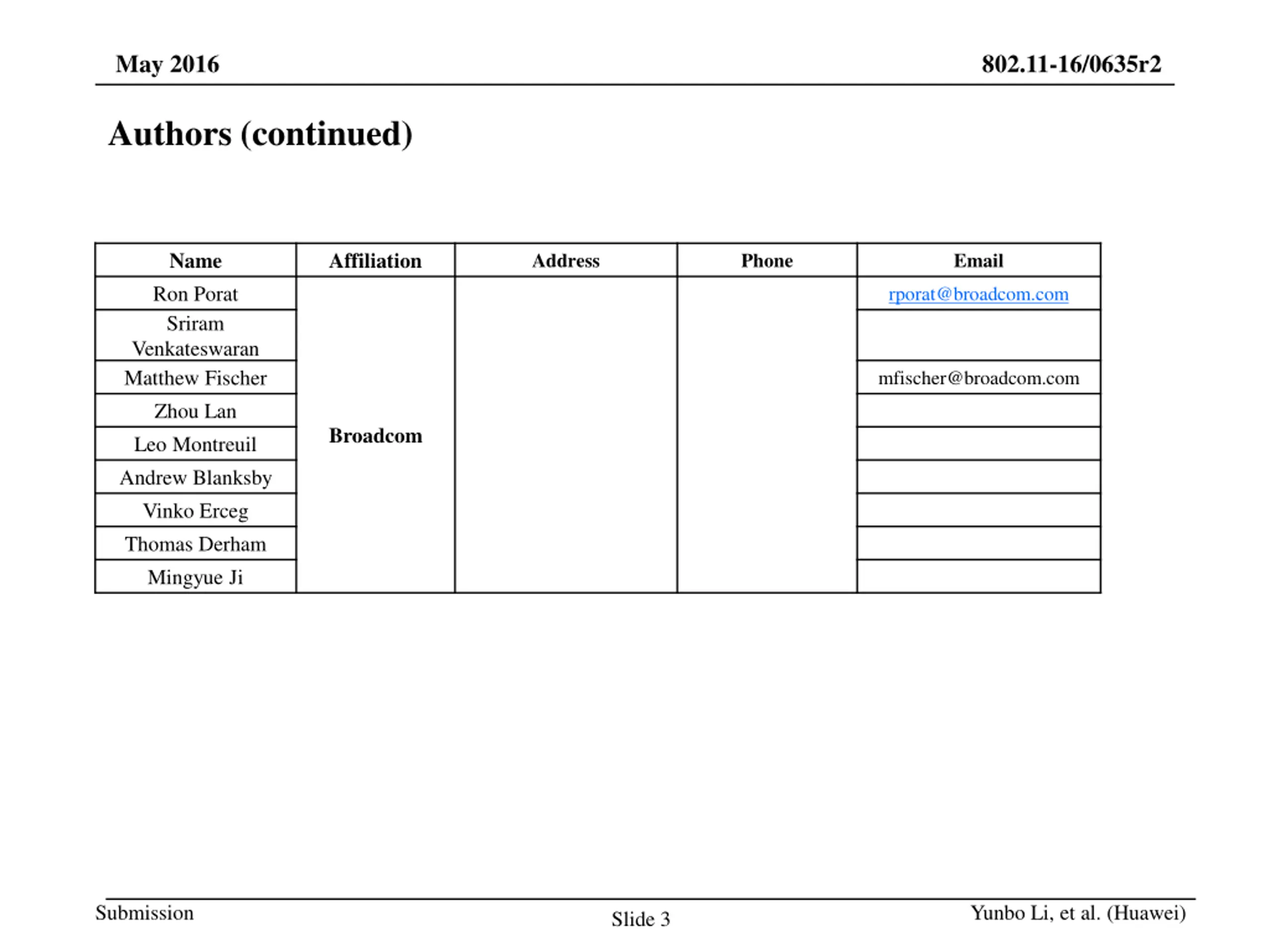 May 2016 802.11-16/0635r2 Authors (continued) Name Ron Porat Sriram Venkateswaran Matthew Fischer Zhou Lan Leo Montreuil Andrew Blanksby Vinko Erceg Thomas Derham Mingyue Ji Affiliation Address Phone Email rporat@broadcom.com mfischer@broadcom.com Broadcom Submission Yunbo Li, et al. (Huawei) Slide 3