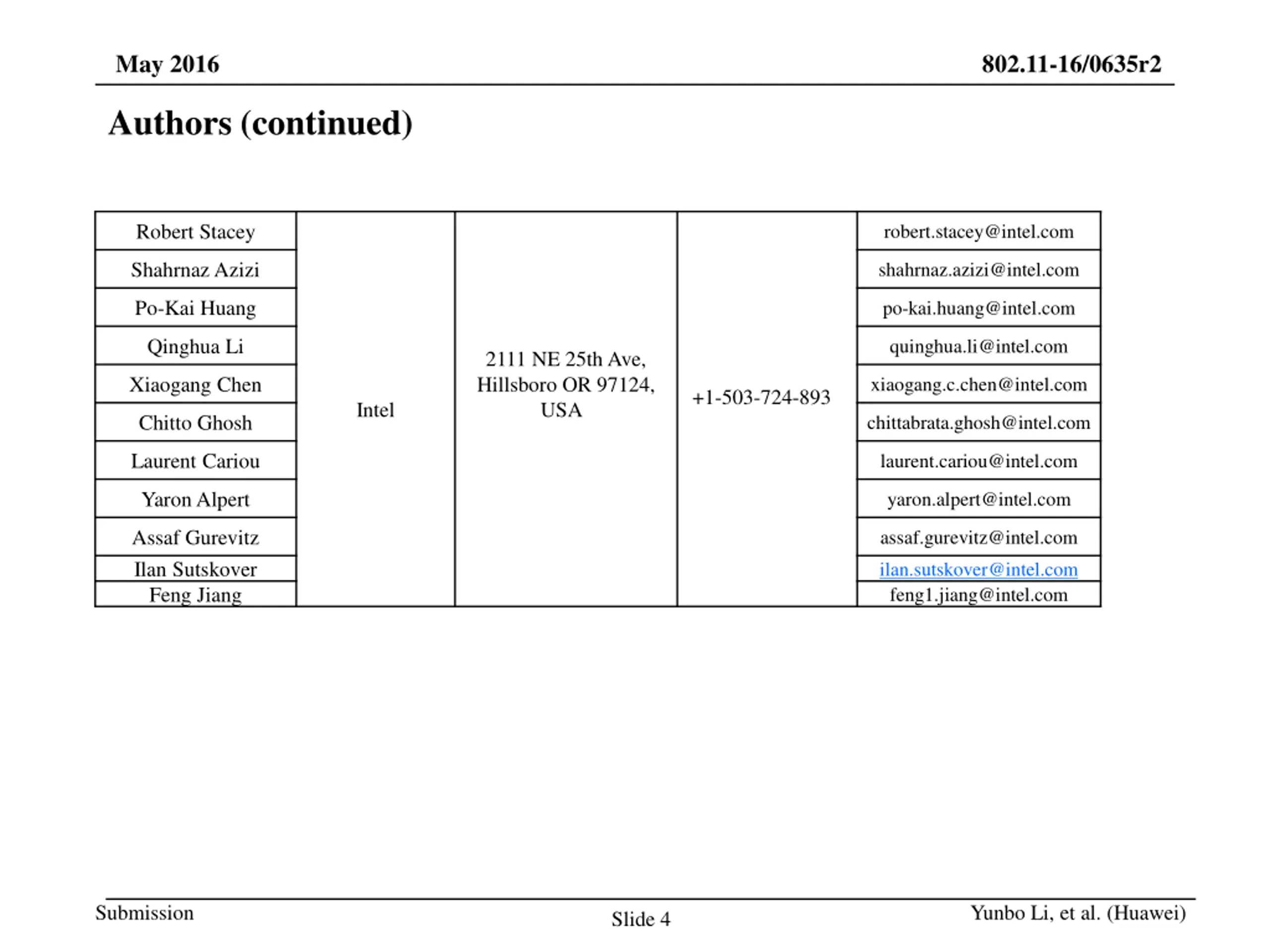 May 2016 802.11-16/0635r2 Authors (continued) Robert Stacey robert.stacey@intel.com Shahrnaz Azizi shahrnaz.azizi@intel.com Po-Kai Huang po-kai.huang@intel.com Qinghua Li quinghua.li@intel.com 2111 NE 25th Ave, Hillsboro OR 97124, USA Xiaogang Chen xiaogang.c.chen@intel.com +1-503-724-893 Intel Chitto Ghosh chittabrata.ghosh@intel.com Laurent Cariou laurent.cariou@intel.com Yaron Alpert yaron.alpert@intel.com Assaf Gurevitz Ilan Sutskover Feng Jiang assaf.gurevitz@intel.com ilan.sutskover@intel.com feng1.jiang@intel.com Submission Yunbo Li, et al. (Huawei) Slide 4