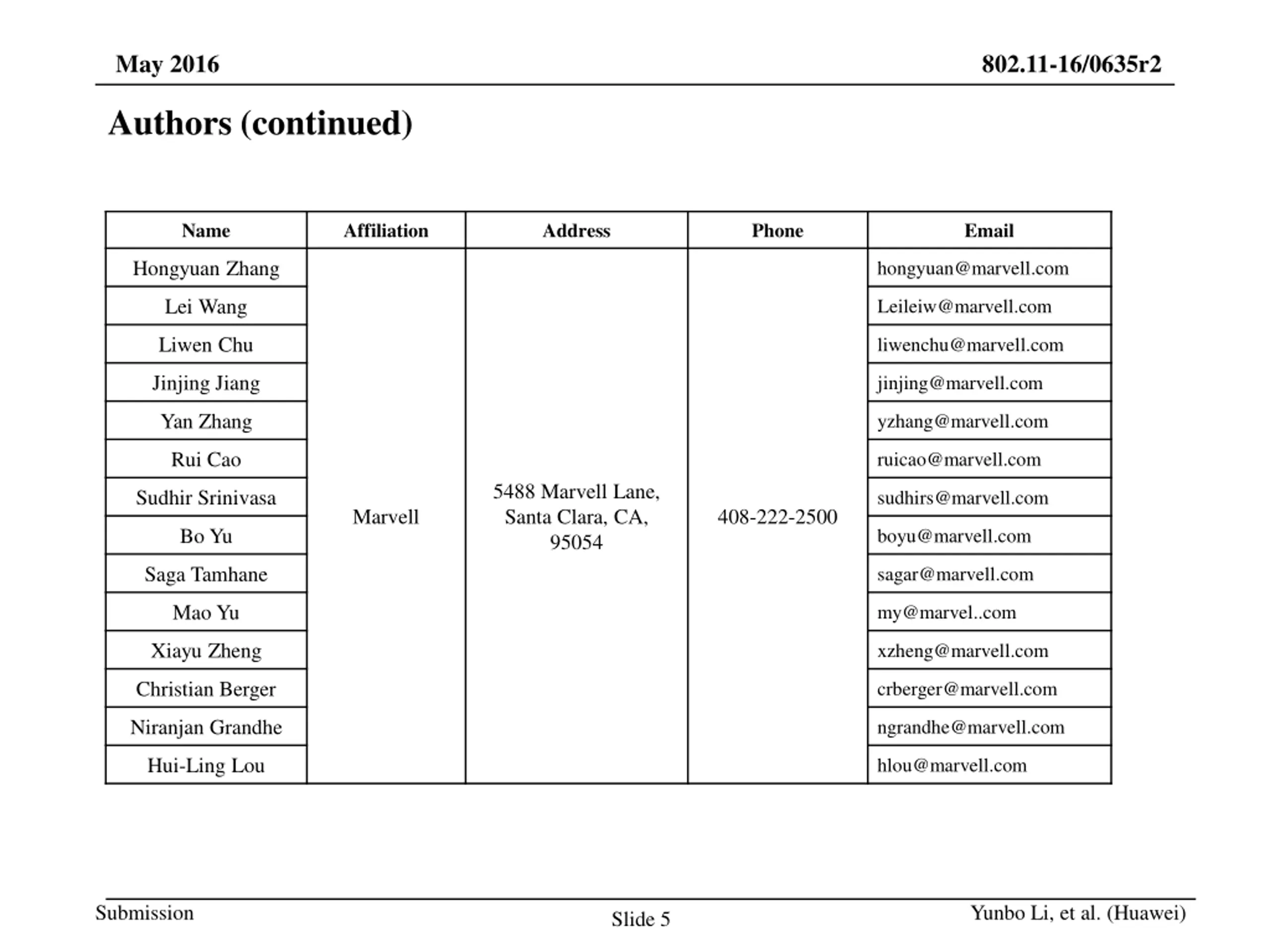 May 2016 802.11-16/0635r2 Authors (continued) Name Affiliation Address Phone Email Hongyuan Zhang hongyuan@marvell.com Lei Wang Leileiw@marvell.com Liwen Chu liwenchu@marvell.com Jinjing Jiang jinjing@marvell.com Yan Zhang yzhang@marvell.com Rui Cao ruicao@marvell.com 5488 Marvell Lane, Santa Clara, CA, 95054 Sudhir Srinivasa sudhirs@marvell.com Marvell 408-222-2500 Bo Yu boyu@marvell.com Saga Tamhane sagar@marvell.com Mao Yu my@marvel..com Xiayu Zheng xzheng@marvell.com Christian Berger crberger@marvell.com Niranjan Grandhe ngrandhe@marvell.com Hui-Ling Lou hlou@marvell.com Submission Yunbo Li, et al. (Huawei) Slide 5