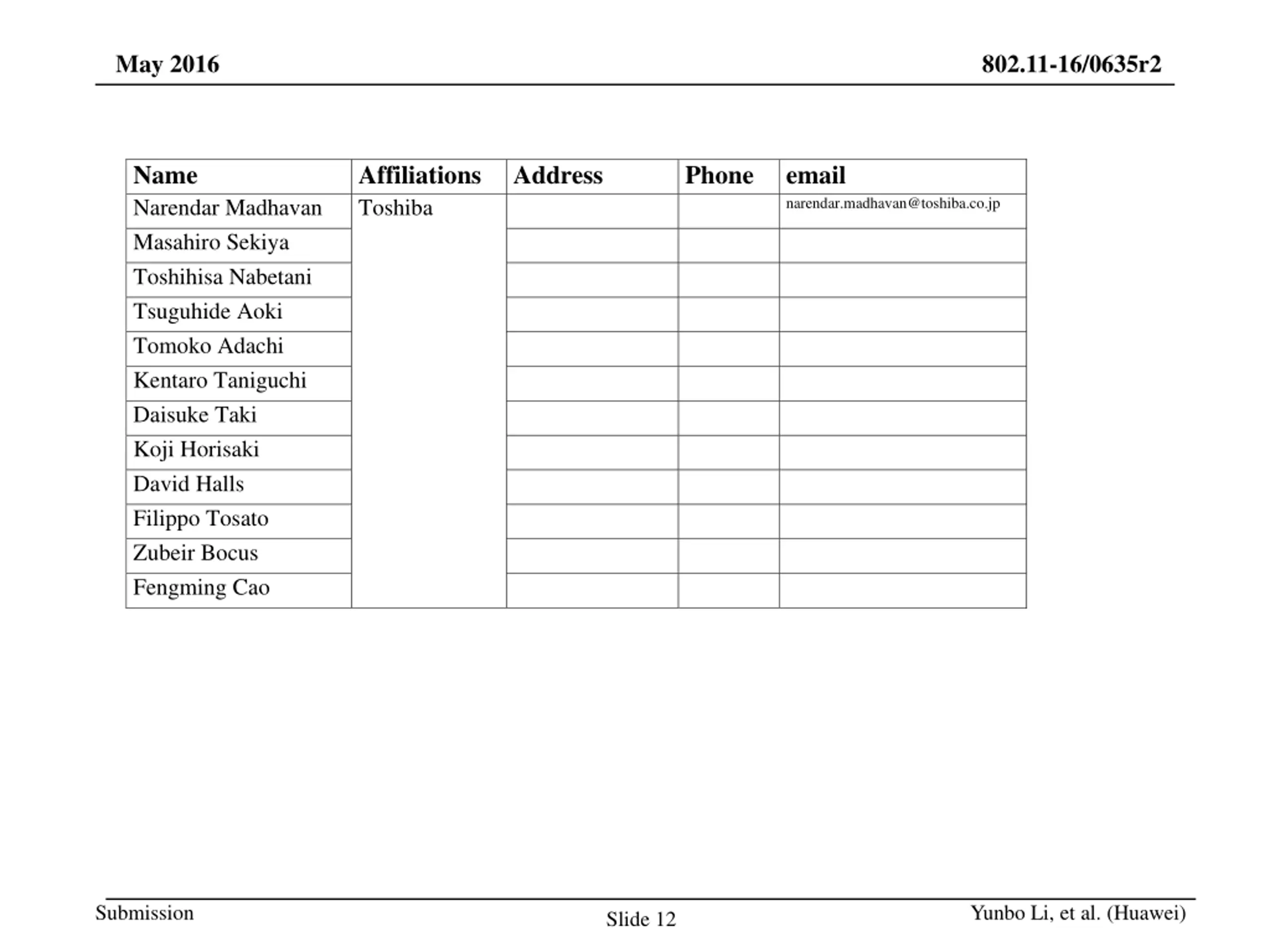 May 2016 802.11-16/0635r2 Name Narendar Madhavan Masahiro Sekiya Toshihisa Nabetani Tsuguhide Aoki Tomoko Adachi Kentaro Taniguchi Daisuke Taki Koji Horisaki David Halls Filippo Tosato Zubeir Bocus Fengming Cao Affiliations Toshiba Address Phone email narendar.madhavan@toshiba.co.jp Submission Yunbo Li, et al. (Huawei) Slide 12