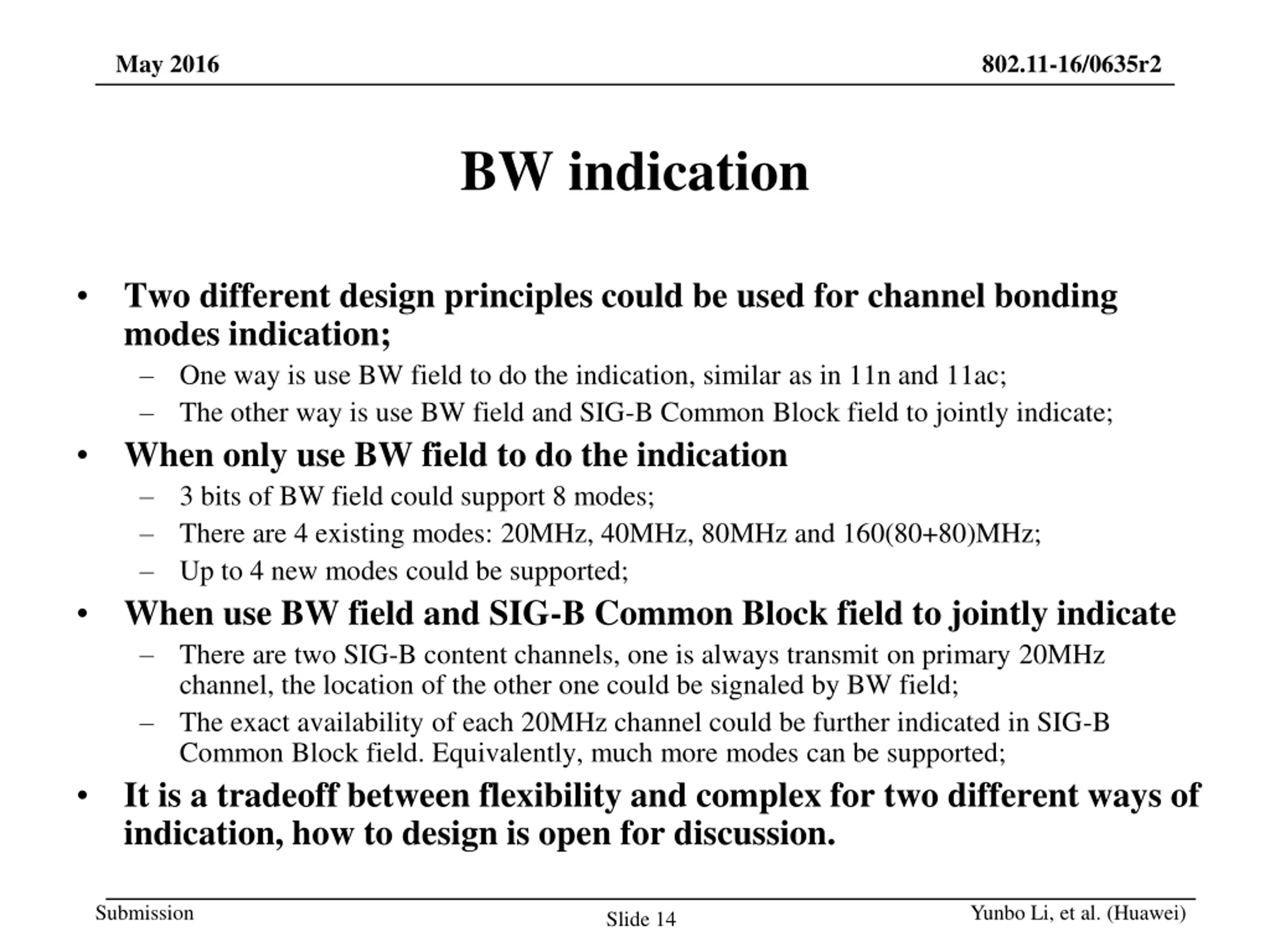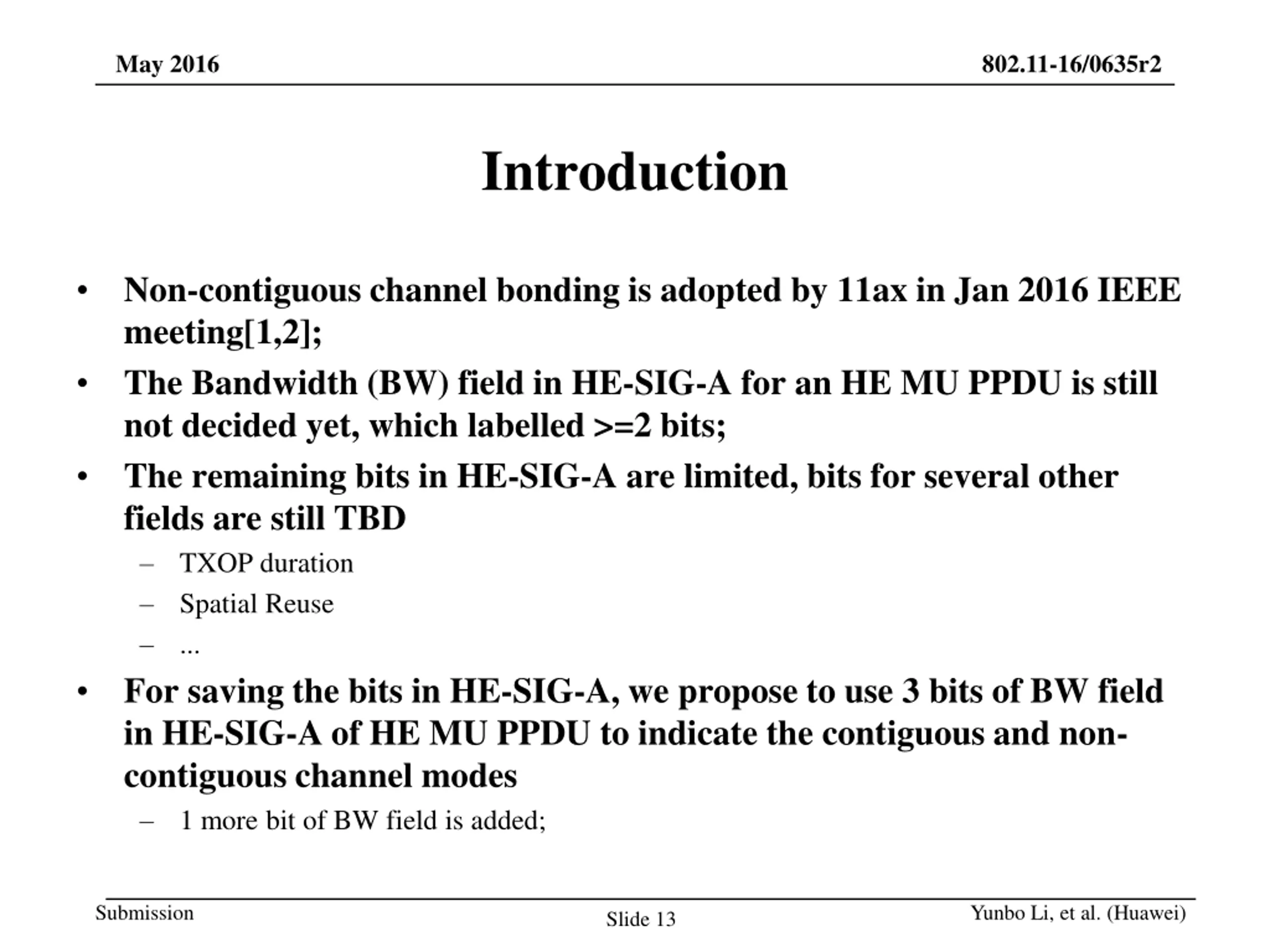 May 2016 802.11-16/0635r2 Introduction Non-contiguous channel bonding is adopted by 11ax in Jan 2016 IEEE meeting[1,2]; The Bandwidth (BW) field in HE-SIG-A for an HE MU PPDU is still not decided yet, which labelled >=2 bits; The remaining bits in HE-SIG-A are limited, bits for several other fields are still TBD TXOP duration Spatial Reuse ... For saving the bits in HE-SIG-A, we propose to use 3 bits of BW field in HE-SIG-A of HE MU PPDU to indicate the contiguous and non- contiguous channel modes 1 more bit of BW field is added; Submission Yunbo Li, et al. (Huawei) Slide 13