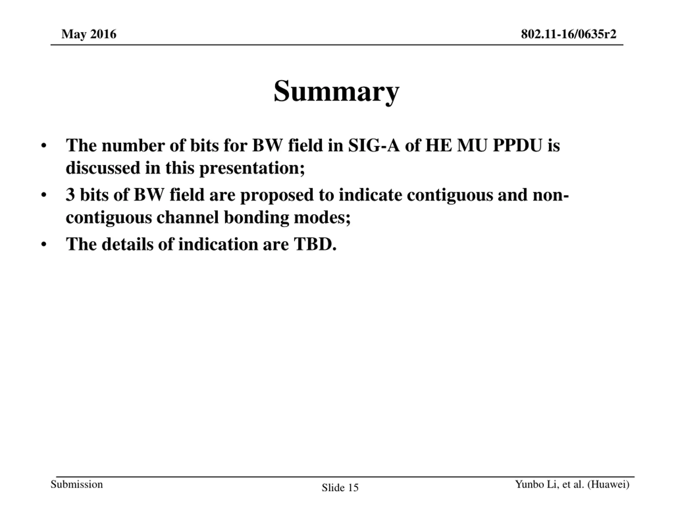 May 2016 802.11-16/0635r2 Summary The number of bits for BW field in SIG-A of HE MU PPDU is discussed in this presentation; 3 bits of BW field are proposed to indicate contiguous and non- contiguous channel bonding modes; The details of indication are TBD. Submission Yunbo Li, et al. (Huawei) Slide 15