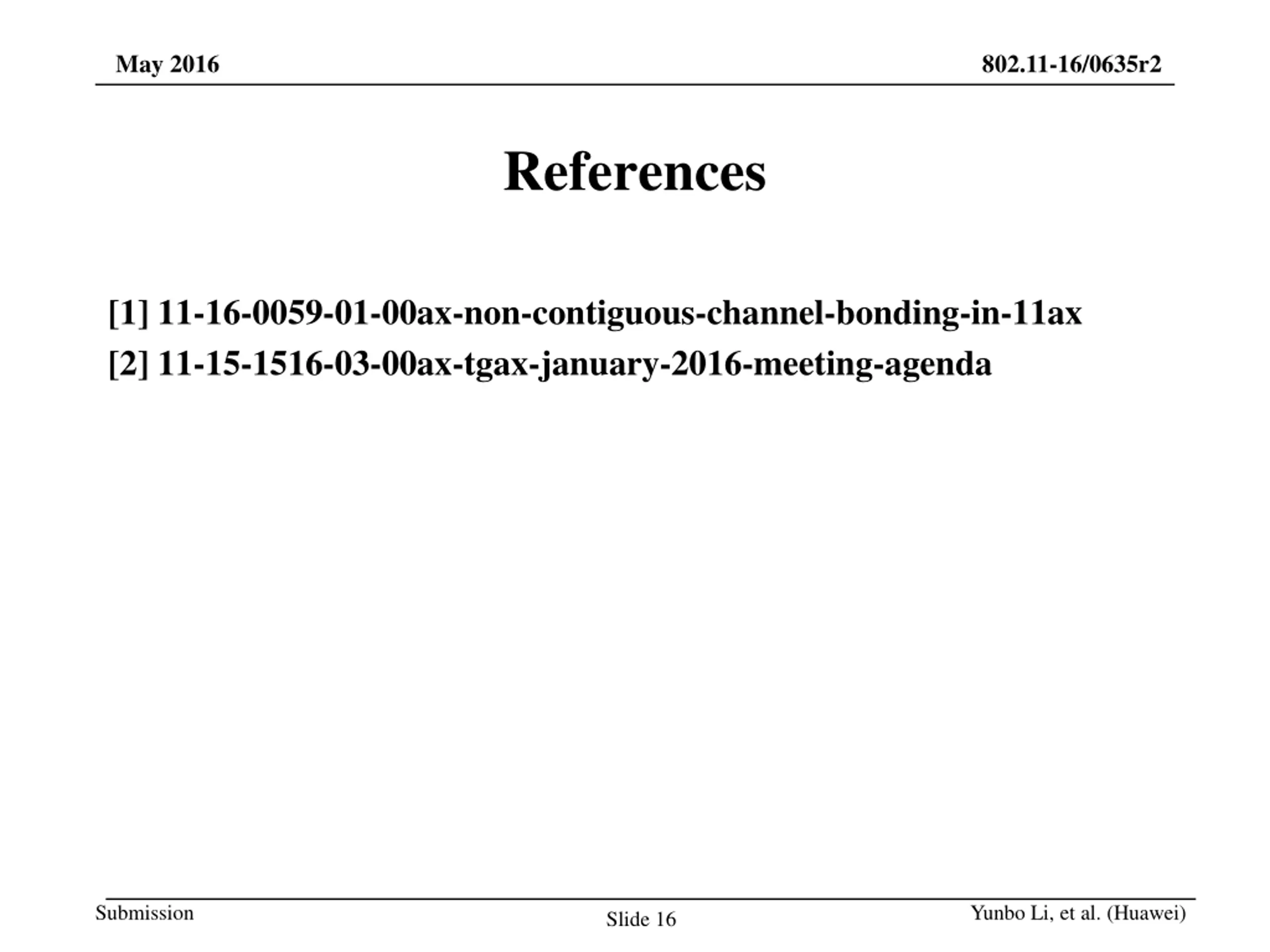 May 2016 802.11-16/0635r2 References [1] 11-16-0059-01-00ax-non-contiguous-channel-bonding-in-11ax [2] 11-15-1516-03-00ax-tgax-january-2016-meeting-agenda Submission Yunbo Li, et al. (Huawei) Slide 16