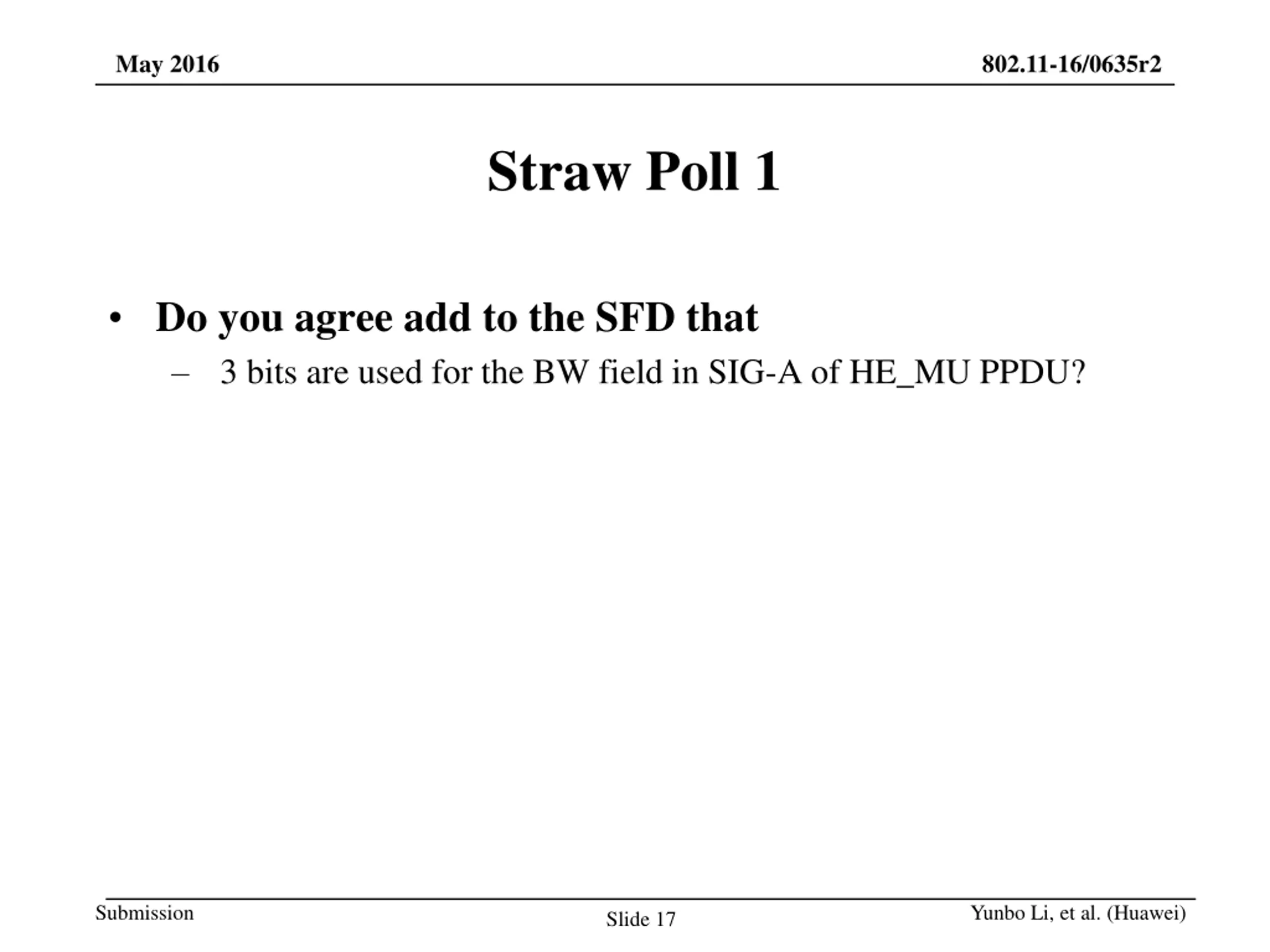 May 2016 802.11-16/0635r2 Straw Poll 1 Do you agree add to the SFD that 3 bits are used for the BW field in SIG-A of HE_MU PPDU? Submission Yunbo Li, et al. (Huawei) Slide 17