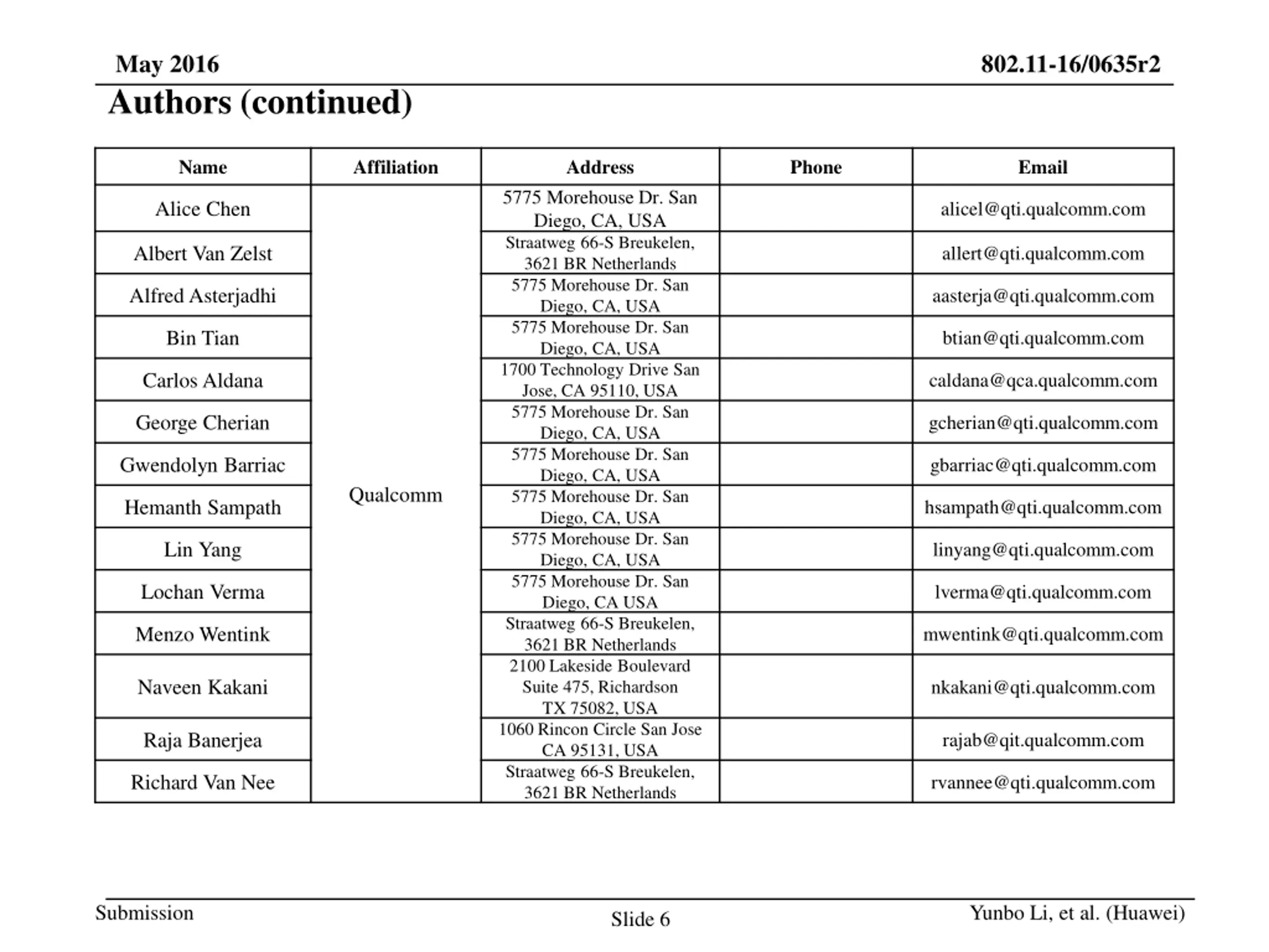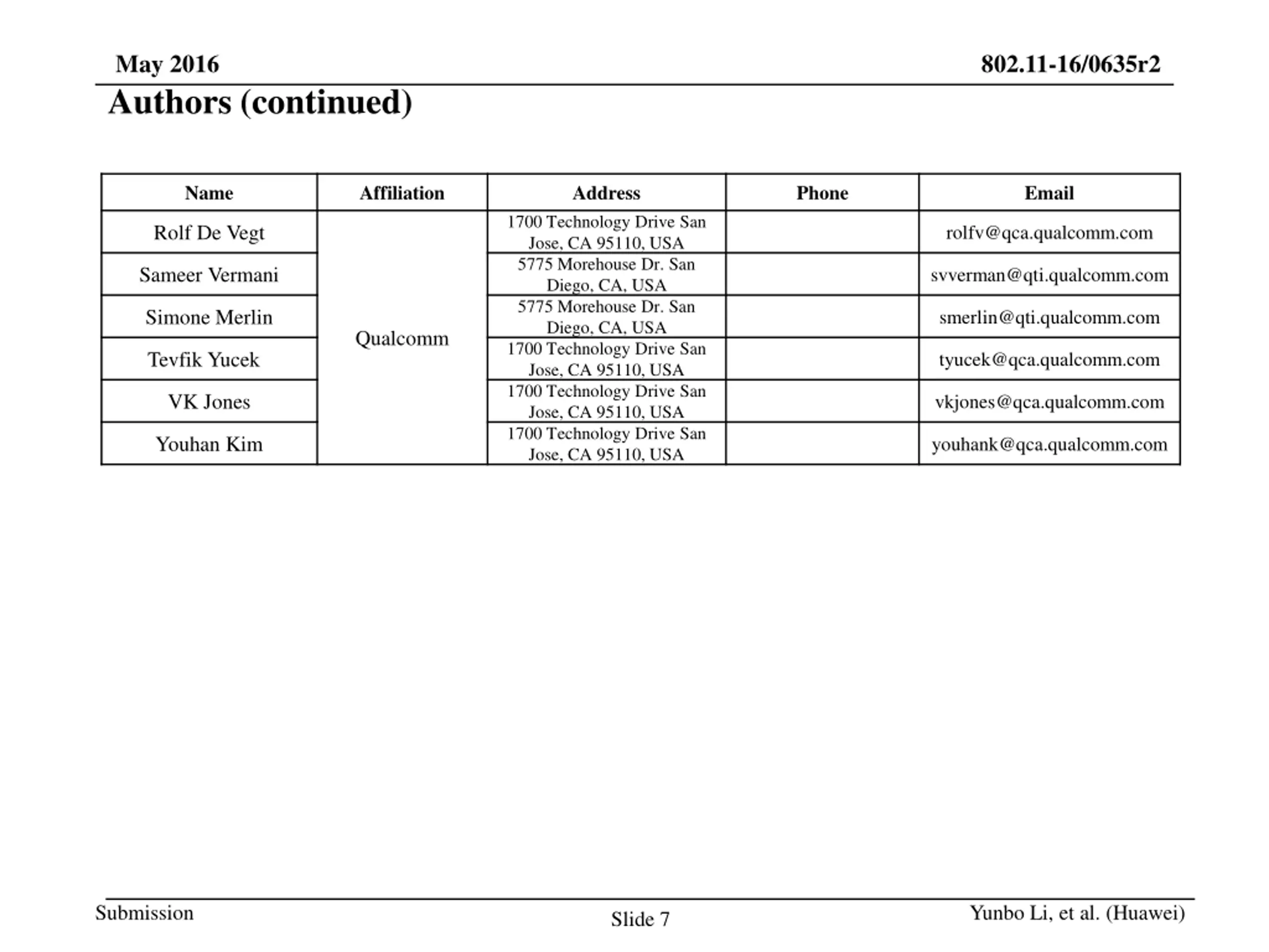 May 2016 Authors (continued) 802.11-16/0635r2 Name Affiliation Address Phone Email 5775 Morehouse Dr. San Diego, CA, USA Straatweg 66-S Breukelen, 3621 BR Netherlands 5775 Morehouse Dr. San Diego, CA, USA 5775 Morehouse Dr. San Diego, CA, USA 1700 Technology Drive San Jose, CA 95110, USA 5775 Morehouse Dr. San Diego, CA, USA 5775 Morehouse Dr. San Diego, CA, USA 5775 Morehouse Dr. San Diego, CA, USA 5775 Morehouse Dr. San Diego, CA, USA 5775 Morehouse Dr. San Diego, CA USA Straatweg 66-S Breukelen, 3621 BR Netherlands 2100 Lakeside Boulevard Suite 475, Richardson TX 75082, USA 1060 Rincon Circle San Jose CA 95131, USA Straatweg 66-S Breukelen, 3621 BR Netherlands Alice Chen alicel@qti.qualcomm.com Albert Van Zelst allert@qti.qualcomm.com Alfred Asterjadhi aasterja@qti.qualcomm.com Bin Tian btian@qti.qualcomm.com Carlos Aldana caldana@qca.qualcomm.com George Cherian gcherian@qti.qualcomm.com Gwendolyn Barriac gbarriac@qti.qualcomm.com Qualcomm Hemanth Sampath hsampath@qti.qualcomm.com Lin Yang linyang@qti.qualcomm.com Lochan Verma lverma@qti.qualcomm.com Menzo Wentink mwentink@qti.qualcomm.com Naveen Kakani nkakani@qti.qualcomm.com Raja Banerjea rajab@qit.qualcomm.com Richard Van Nee rvannee@qti.qualcomm.com Submission Yunbo Li, et al. (Huawei) Slide 6