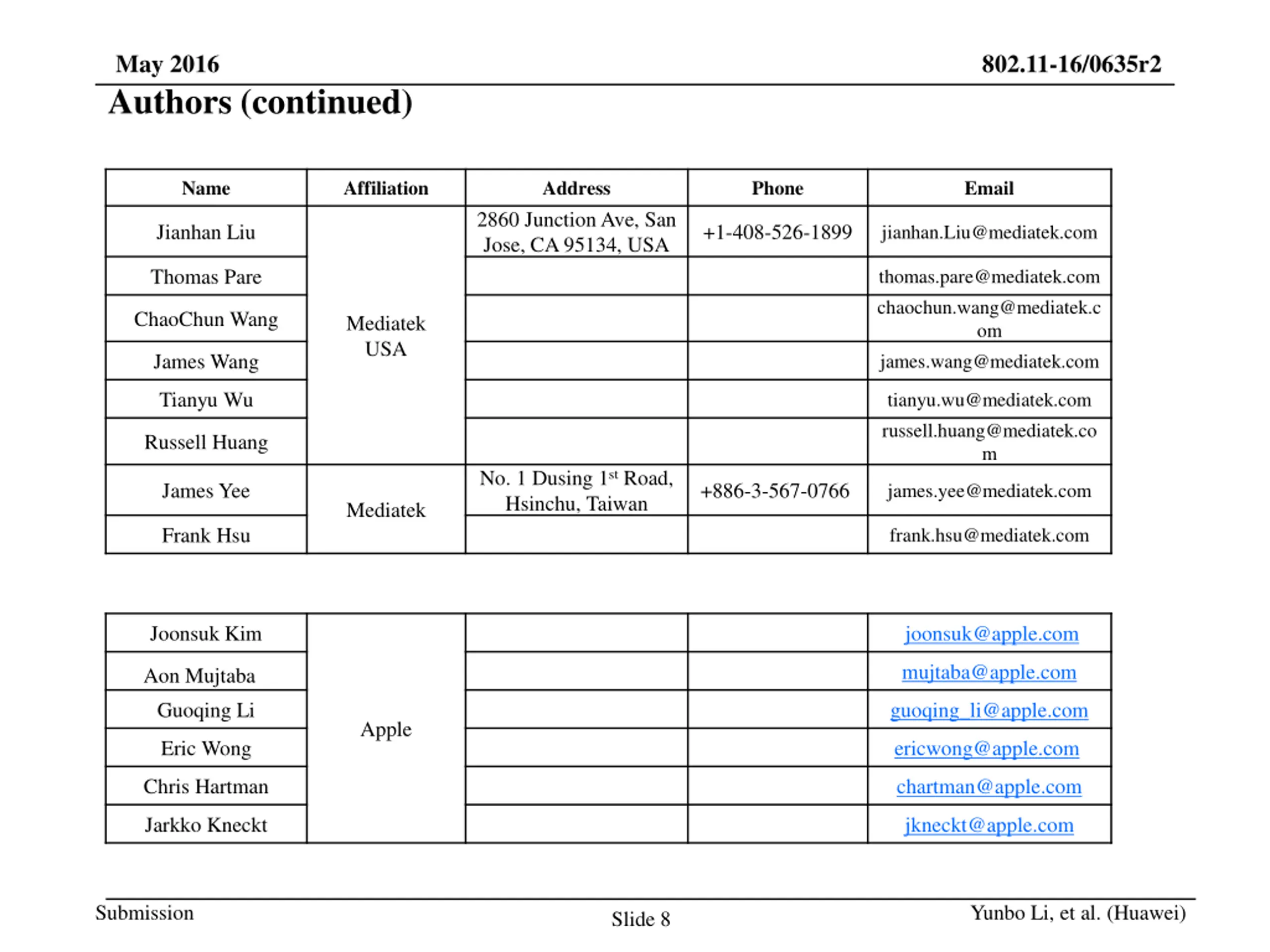 May 2016 Authors (continued) 802.11-16/0635r2 Name Affiliation Address Phone Email 1700 Technology Drive San Jose, CA 95110, USA 5775 Morehouse Dr. San Diego, CA, USA 5775 Morehouse Dr. San Diego, CA, USA 1700 Technology Drive San Jose, CA 95110, USA 1700 Technology Drive San Jose, CA 95110, USA 1700 Technology Drive San Jose, CA 95110, USA Rolf De Vegt rolfv@qca.qualcomm.com Sameer Vermani svverman@qti.qualcomm.com Simone Merlin smerlin@qti.qualcomm.com Qualcomm Tevfik Yucek tyucek@qca.qualcomm.com VK Jones vkjones@qca.qualcomm.com Youhan Kim youhank@qca.qualcomm.com Submission Yunbo Li, et al. (Huawei) Slide 7