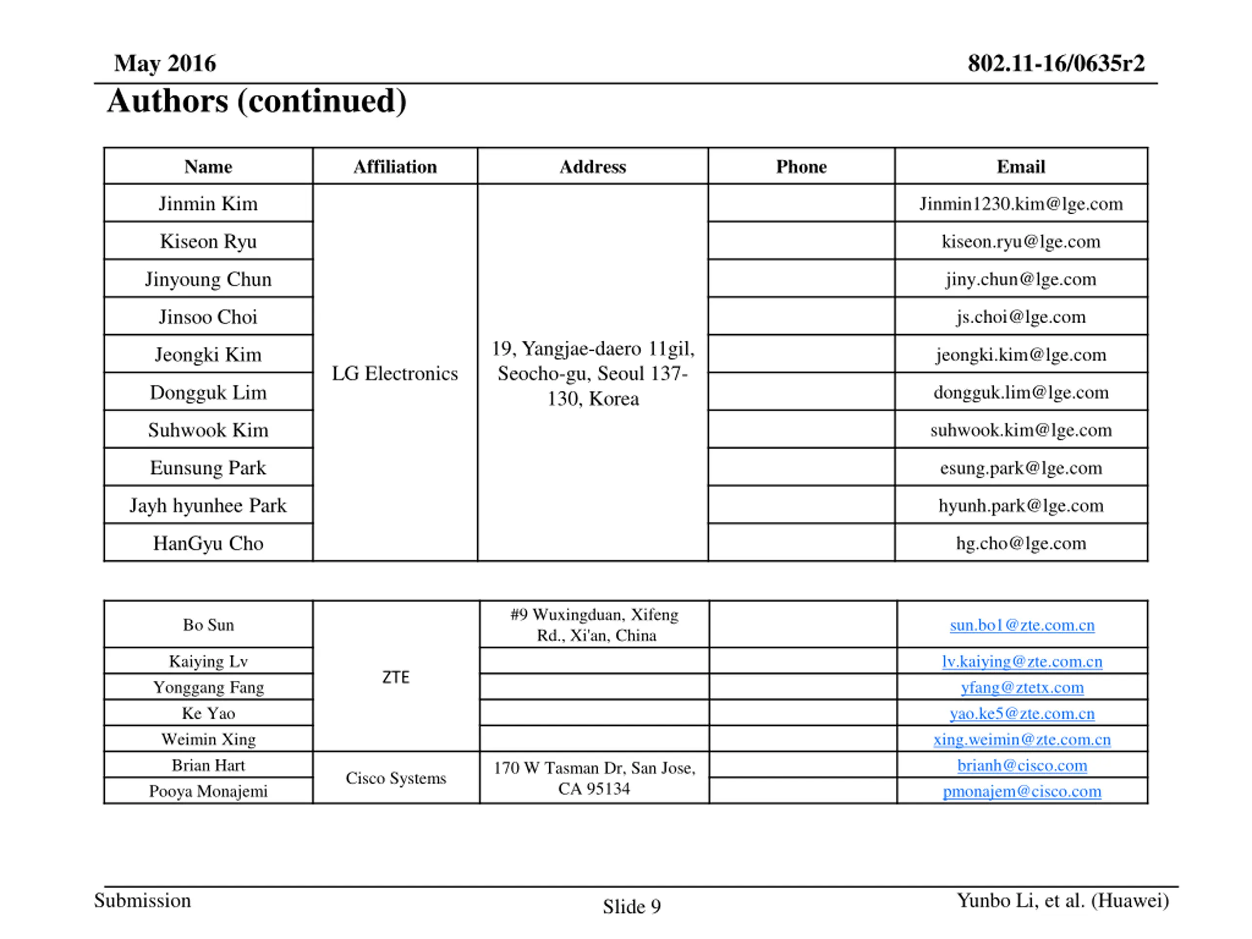 May 2016 Authors (continued) 802.11-16/0635r2 Name Affiliation Address Phone Email 2860 Junction Ave, San Jose, CA 95134, USA Jianhan Liu +1-408-526-1899 jianhan.Liu@mediatek.com Thomas Pare thomas.pare@mediatek.com chaochun.wang@mediatek.c om james.wang@mediatek.com ChaoChun Wang Mediatek USA James Wang Tianyu Wu tianyu.wu@mediatek.com russell.huang@mediatek.co m Russell Huang No. 1 Dusing 1st Road, Hsinchu, Taiwan James Yee +886-3-567-0766 james.yee@mediatek.com Mediatek Frank Hsu frank.hsu@mediatek.com Joonsuk Kim joonsuk@apple.com mujtaba@apple.com Aon Mujtaba Guoqing Li guoqing_li@apple.com Apple Eric Wong ericwong@apple.com Chris Hartman chartman@apple.com Jarkko Kneckt jkneckt@apple.com Submission Yunbo Li, et al. (Huawei) Slide 8