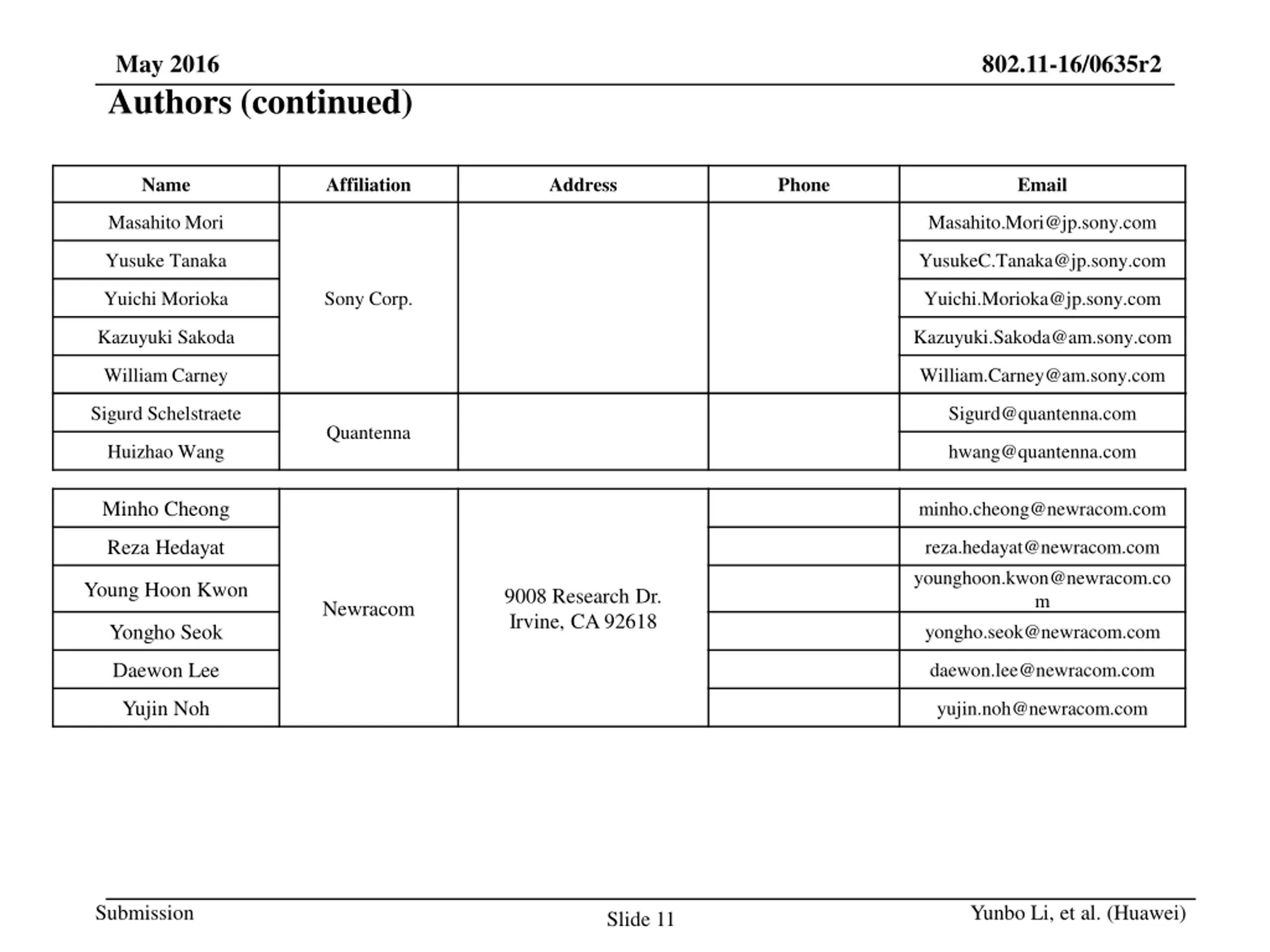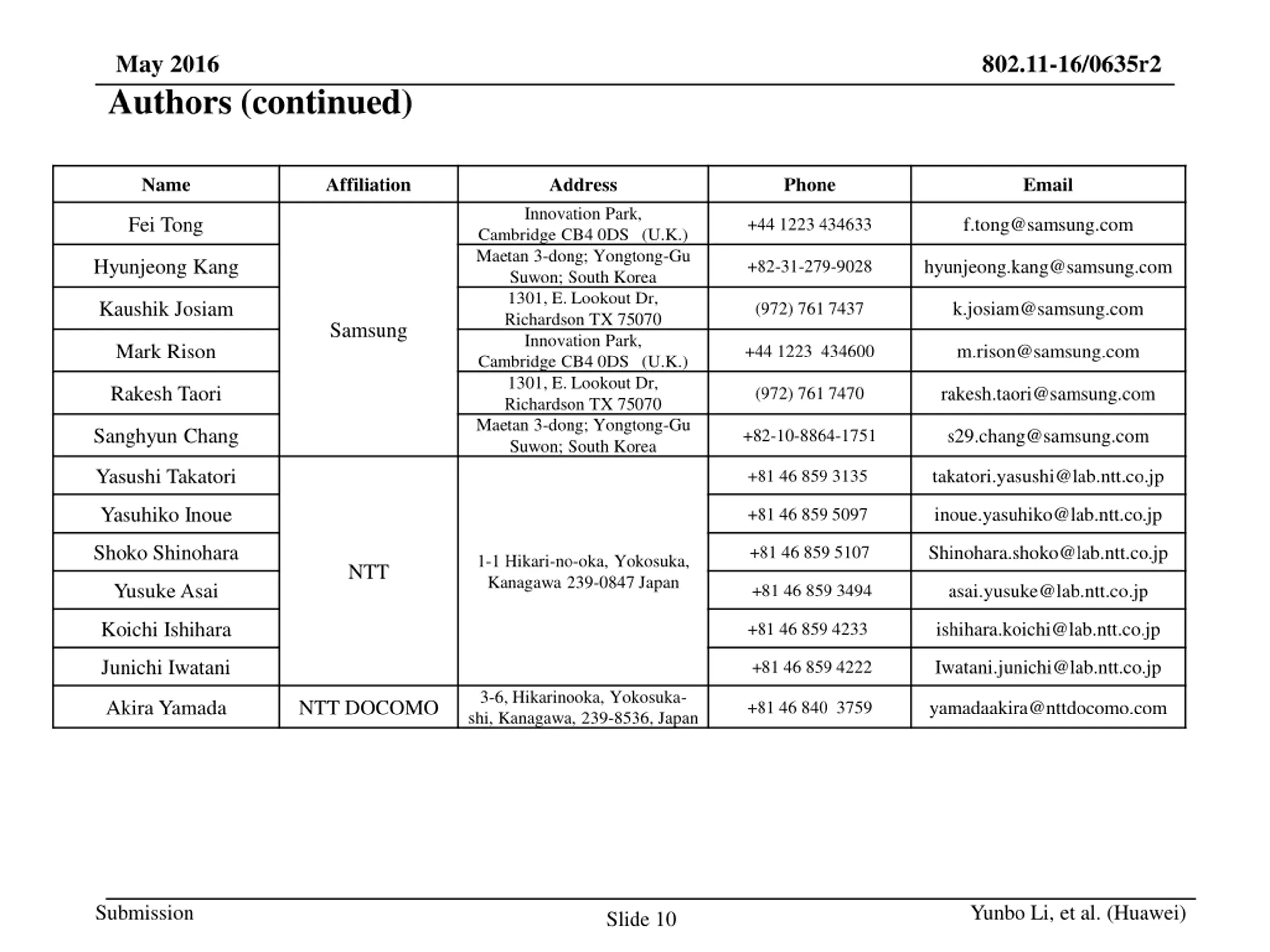 May 2016 Authors (continued) 802.11-16/0635r2 Name Affiliation Address Innovation Park, Cambridge CB4 0DS (U.K.) Maetan 3-dong; Yongtong-Gu Suwon; South Korea 1301, E. Lookout Dr, Richardson TX 75070 Innovation Park, Cambridge CB4 0DS (U.K.) 1301, E. Lookout Dr, Richardson TX 75070 Maetan 3-dong; Yongtong-Gu Suwon; South Korea Phone Email Fei Tong f.tong@samsung.com +44 1223 434633 Hyunjeong Kang hyunjeong.kang@samsung.com +82-31-279-9028 Kaushik Josiam k.josiam@samsung.com (972) 761 7437 Samsung Mark Rison m.rison@samsung.com +44 1223 434600 Rakesh Taori rakesh.taori@samsung.com (972) 761 7470 Sanghyun Chang s29.chang@samsung.com +82-10-8864-1751 Yasushi Takatori takatori.yasushi@lab.ntt.co.jp +81 46 859 3135 Yasuhiko Inoue inoue.yasuhiko@lab.ntt.co.jp +81 46 859 5097 Shoko Shinohara Shinohara.shoko@lab.ntt.co.jp +81 46 859 5107 1-1 Hikari-no-oka, Yokosuka, Kanagawa 239-0847 Japan NTT Yusuke Asai asai.yusuke@lab.ntt.co.jp +81 46 859 3494 Koichi Ishihara ishihara.koichi@lab.ntt.co.jp +81 46 859 4233 Junichi Iwatani Iwatani.junichi@lab.ntt.co.jp +81 46 859 4222 3-6, Hikarinooka, Yokosuka- shi, Kanagawa, 239-8536, Japan Akira Yamada NTT DOCOMO yamadaakira@nttdocomo.com +81 46 840 3759 Submission Yunbo Li, et al. (Huawei) Slide 10