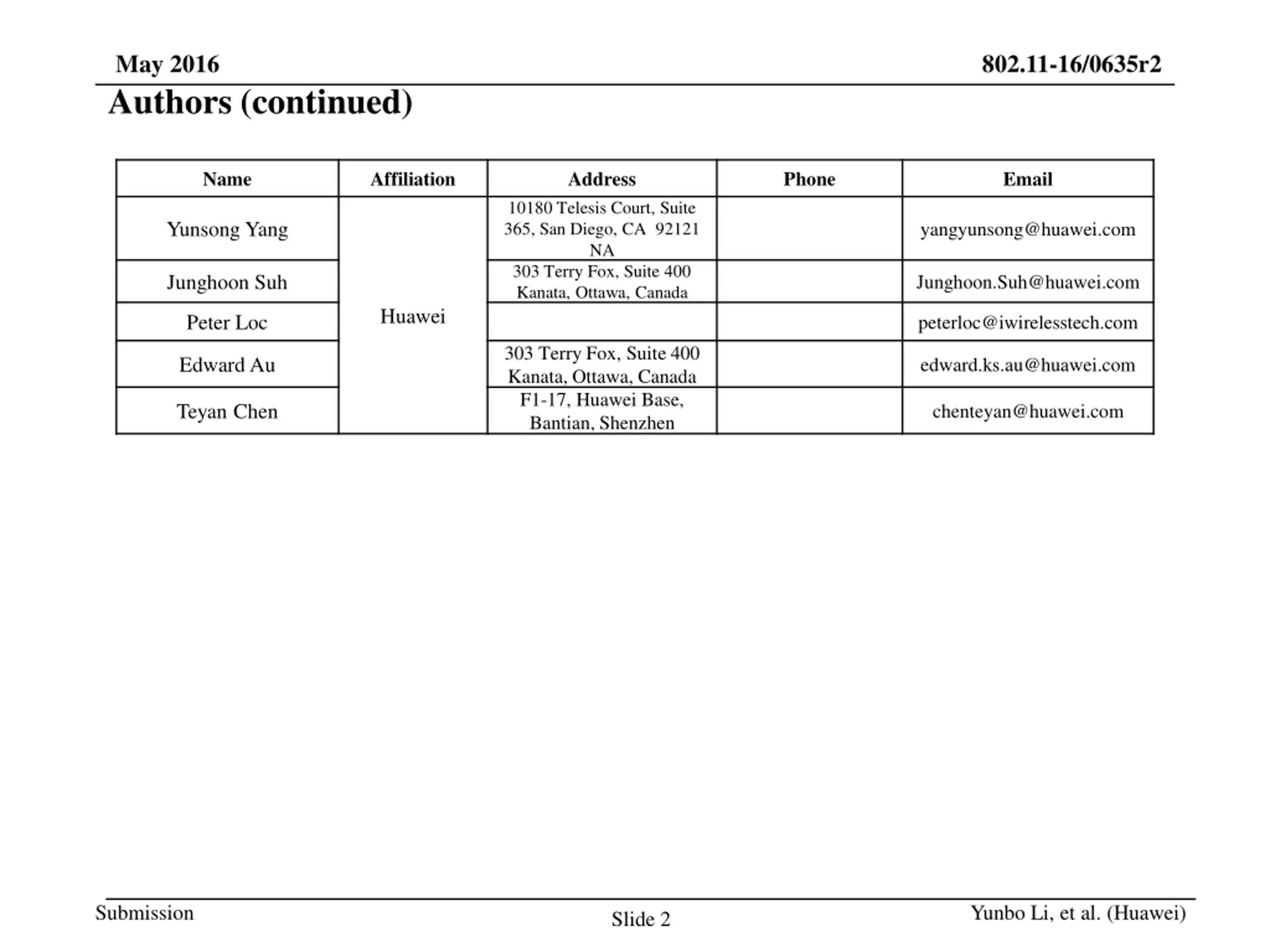 May 2016 Authors (continued) 802.11-16/0635r2 Name Affiliation Address Phone Email 10180 Telesis Court, Suite 365, San Diego, CA 92121 NA 303 Terry Fox, Suite 400 Kanata, Ottawa, Canada Yunsong Yang yangyunsong@huawei.com Junghoon Suh Junghoon.Suh@huawei.com Huawei Peter Loc peterloc@iwirelesstech.com 303 Terry Fox, Suite 400 Kanata, Ottawa, Canada F1-17, Huawei Base, Bantian, Shenzhen Edward Au edward.ks.au@huawei.com Teyan Chen chenteyan@huawei.com Submission Yunbo Li, et al. (Huawei) Slide 2