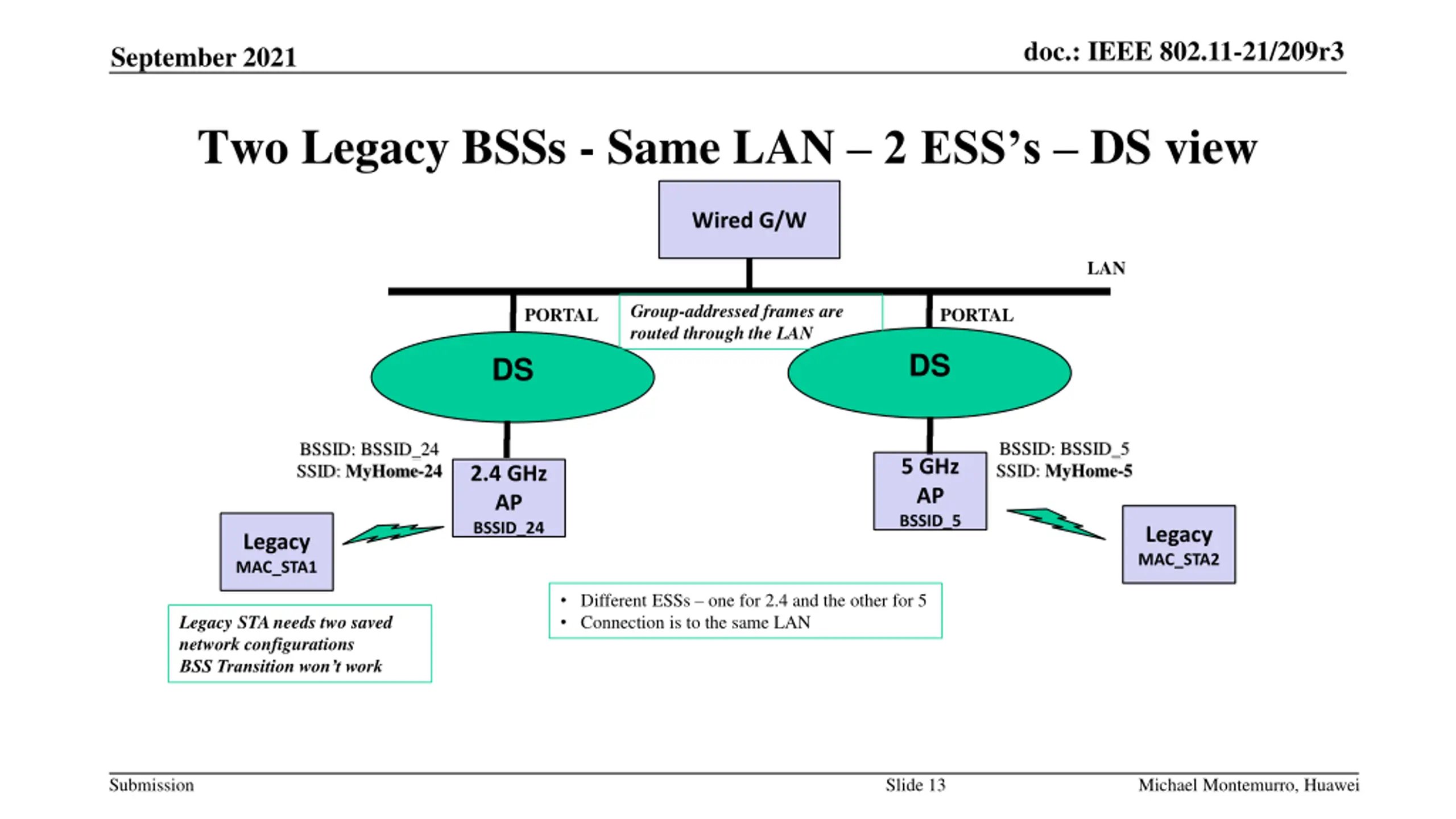 doc.: IEEE 802.11-21/209r3 September 2021 Two Legacy BSSs - Same LAN 2 ESS s DS view Wired G/W LAN Group-addressed frames are routed through the LAN PORTAL PORTAL DS DS BSSID: BSSID_5 SSID: MyHome-5 BSSID: BSSID_24 SSID: MyHome-24 5 GHz AP BSSID_5 2.4 GHz AP BSSID_24 Legacy MAC_STA2 Legacy MAC_STA1 Different ESSs one for 2.4 and the other for 5 Connection is to the same LAN Legacy STA needs two saved network configurations BSS Transition won t work Submission Slide 13 Michael Montemurro, Huawei