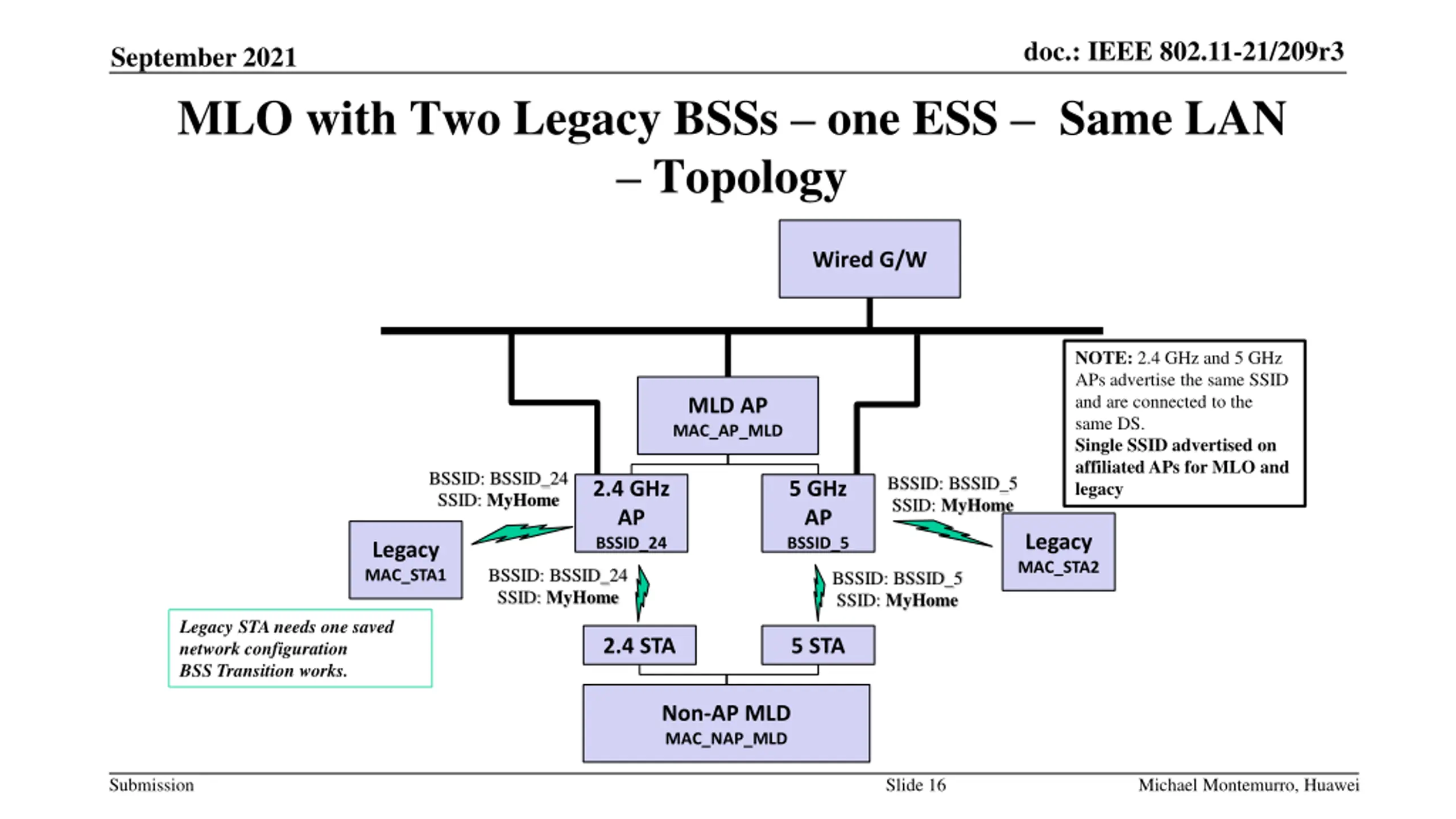 doc.: IEEE 802.11-21/209r3 September 2021 Two Legacy BSSs - Same LAN 1 ESS DS view Wired G/W LAN PORTAL Group-addressed frames are routed through the DS DS BSSID: BSSID_5 SSID: MyHome 5 GHz AP BSSID_5 BSSID: BSSID_24 SSID: MyHome 2.4 GHz AP BSSID_24 Legacy MAC_STA2 Legacy MAC_STA1 Same ESS two APs Single DS Legacy STA needs one saved network configuration BSS Transition works. Submission Slide 15 Michael Montemurro, Huawei