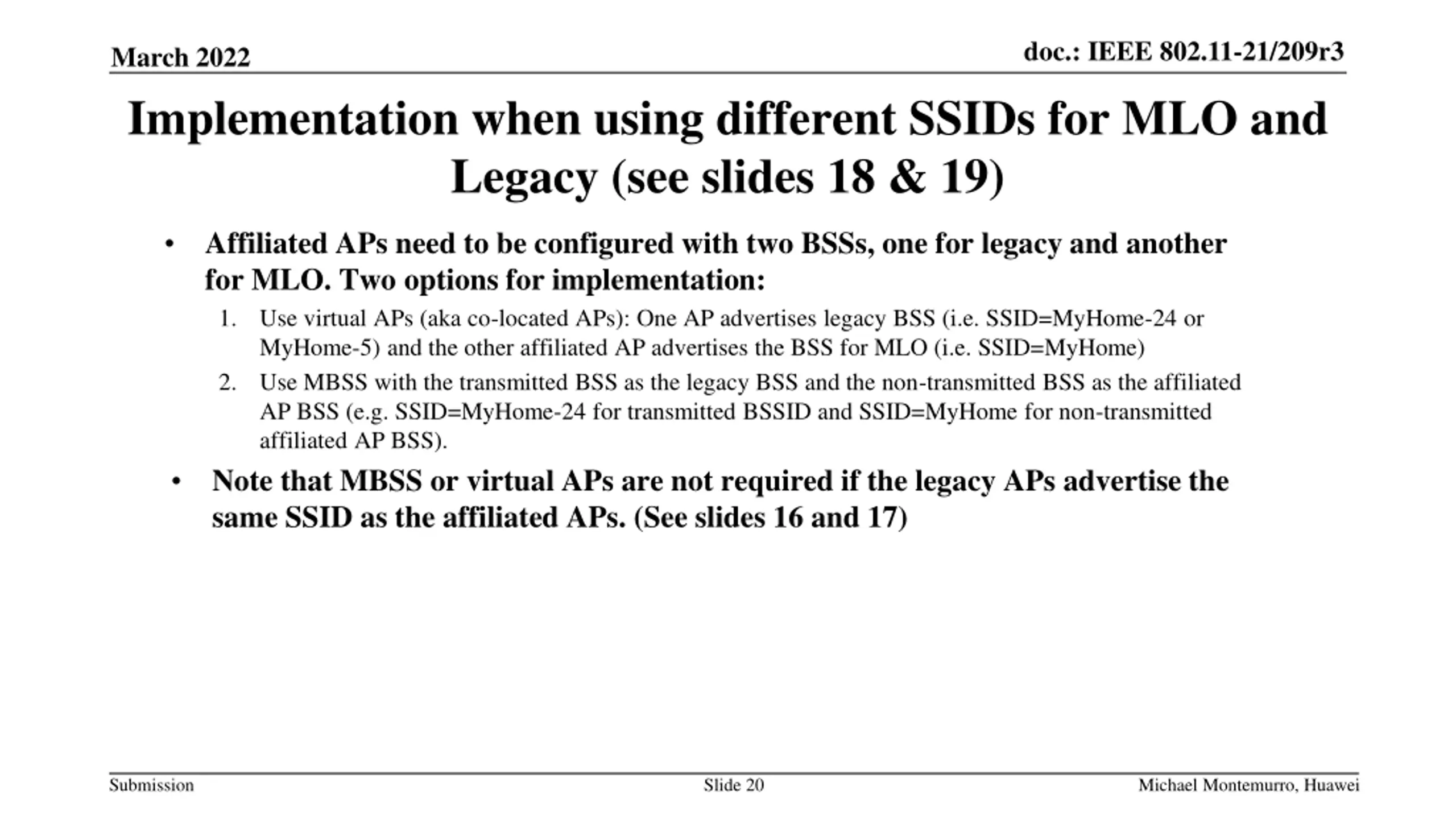 doc.: IEEE 802.11-21/209r3 March 2022 Section 2 SSID, ESS, AND MLO Submission Slide 11 Michael Montemurro, Huawei