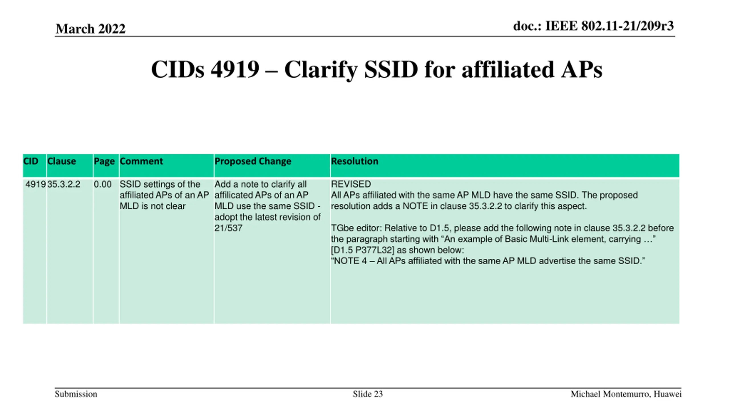 doc.: IEEE 802.11-21/209r3 March 2022 CIDs 4919 Clarify SSID for affiliated APs CID Clause Page Comment Proposed Change Resolution 491935.3.2.2 0.00 SSID settings of the affiliated APs of an AP MLD is not clear Add a note to clarify all affilicated APs of an AP MLD use the same SSID - adopt the latest revision of 21/537 REVISED All APs affiliated with the same AP MLD have the same SSID. The proposed resolution adds a NOTE in clause 35.3.2.2 to clarify this aspect. TGbe editor: Relative to D1.5, please add the following note in clause 35.3.2.2 before the paragraph starting with An example of Basic Multi-Link element, carrying [D1.5 P377L32] as shown below: NOTE 4 All APs affiliated with the same AP MLD advertise the same SSID. Submission Slide 23 Michael Montemurro, Huawei