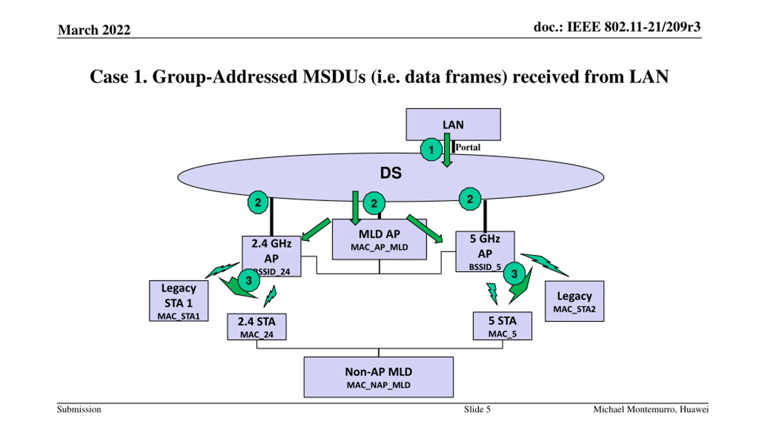 doc.: IEEE 802.11-21/209r3 March 2022 DS Representation of network with legacy STAs Wired LAN Portal NOTE: P802.11be is in the process of agreeing to assign sequence numbers for group-addressed frames at the MLD level. A group- addressed frame will have the same sequence number when it is transmitted by different affiliated APs. DS Affiliated APs connect to the DS to service legacy STAs. MLD AP MAC_AP_MLD 5 GHz AP BSSID_5 2.4 GHz AP BSSID_24 Legacy MAC_STA1 Legacy MAC_STA2 2.4 STA MAC_24 5 STA MAC_5 Non-AP MLD MAC_NAP_MLD Submission Slide 4 Michael Montemurro, Huawei