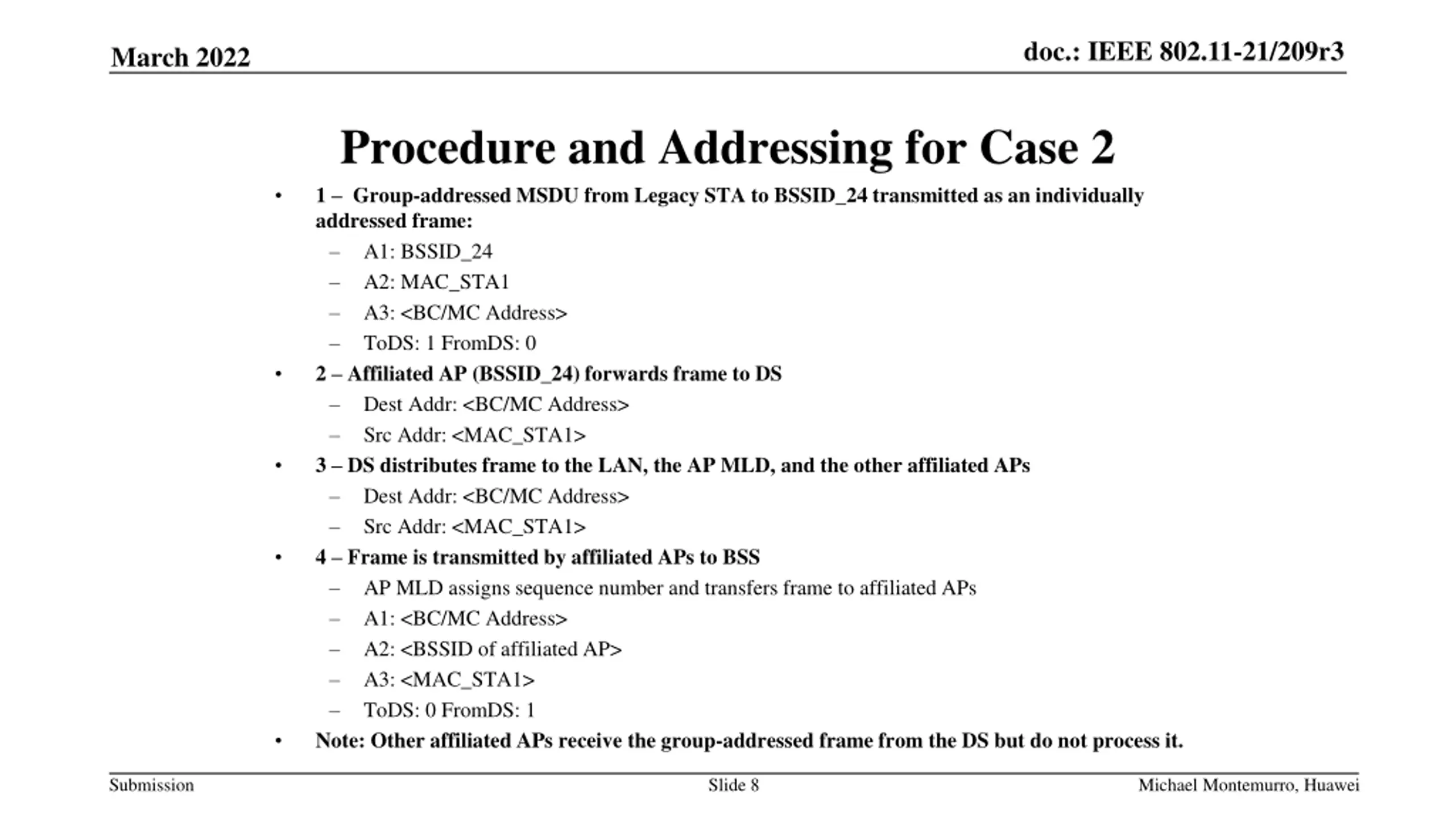 doc.: IEEE 802.11-21/209r3 March 2022 Procedure and Addressing for Case 1 1 Frame goes from LAN to DS: Dest Addr: <BC/MC Address> Src Addr: <STA on LAN> 2 Frame passes from DS to AP MLD and affiliated APs AP MLD assigns sequence number and transfers frame to affiliated APs. Dest Addr: <BC/MC Address> Src Addr: <STA on LAN> 3 Frame is transmitted by affiliated APs to BSS A1: <BC/MC Address> A2: <BSSID of affiliated AP> A3: <STA on LAN> ToDS: 0 FromDS: 1 Note: Affiliated APs receive the group-addressed frame from DS but does not process it. Submission Slide 6 Michael Montemurro, Huawei