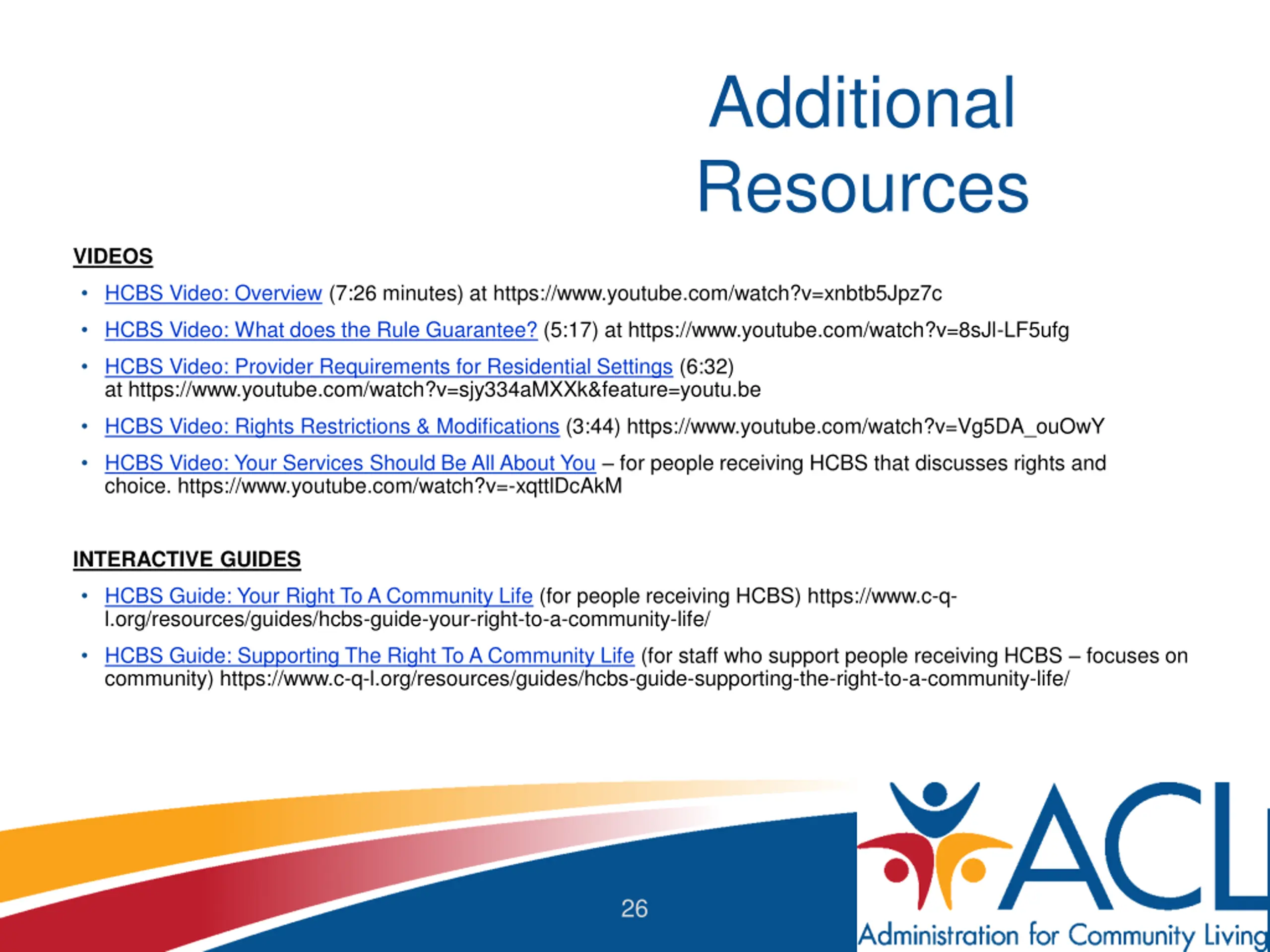 Additional Resources VIDEOS HCBS Video: Overview (7:26 minutes) at https://www.youtube.com/watch?v=xnbtb5Jpz7c HCBS Video: What does the Rule Guarantee? (5:17) at https://www.youtube.com/watch?v=8sJl-LF5ufg HCBS Video: Provider Requirements for Residential Settings (6:32) at https://www.youtube.com/watch?v=sjy334aMXXk&feature=youtu.be HCBS Video: Rights Restrictions & Modifications (3:44) https://www.youtube.com/watch?v=Vg5DA_ouOwY HCBS Video: Your Services Should Be All About You for people receiving HCBS that discusses rights and choice. https://www.youtube.com/watch?v=-xqttlDcAkM INTERACTIVE GUIDES HCBS Guide: Your Right To A Community Life (for people receiving HCBS) https://www.c-q- l.org/resources/guides/hcbs-guide-your-right-to-a-community-life/ HCBS Guide: Supporting The Right To A Community Life (for staff who support people receiving HCBS focuses on community) https://www.c-q-l.org/resources/guides/hcbs-guide-supporting-the-right-to-a-community-life/ 26