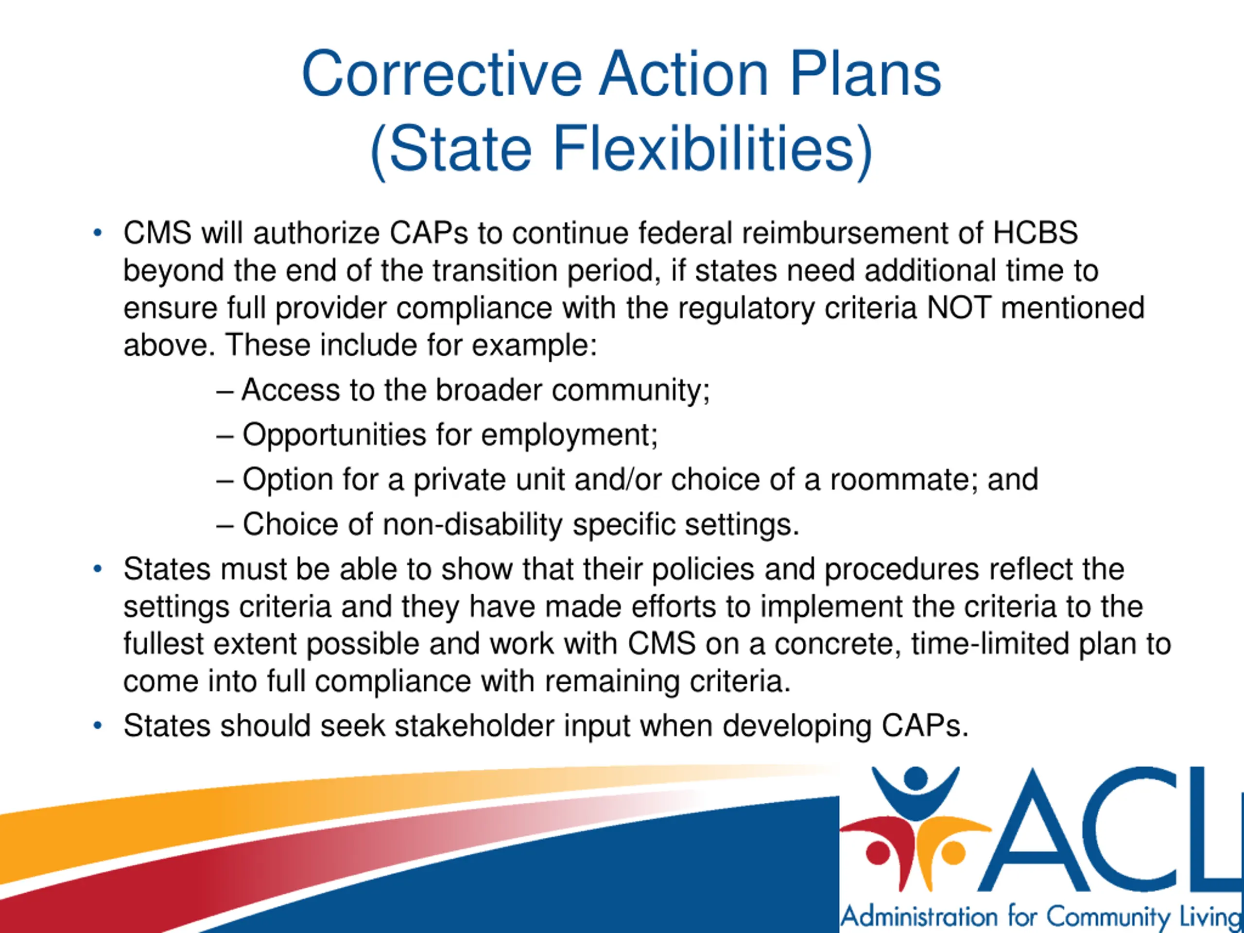 Corrective Action Plans (State Flexibilities) CMS will authorize CAPs to continue federal reimbursement of HCBS beyond the end of the transition period, if states need additional time to ensure full provider compliance with the regulatory criteria NOT mentioned above. These include for example: Access to the broader community; Opportunities for employment; Option for a private unit and/or choice of a roommate; and Choice of non-disability specific settings. States must be able to show that their policies and procedures reflect the settings criteria and they have made efforts to implement the criteria to the fullest extent possible and work with CMS on a concrete, time-limited plan to come into full compliance with remaining criteria. States should seek stakeholder input when developing CAPs.