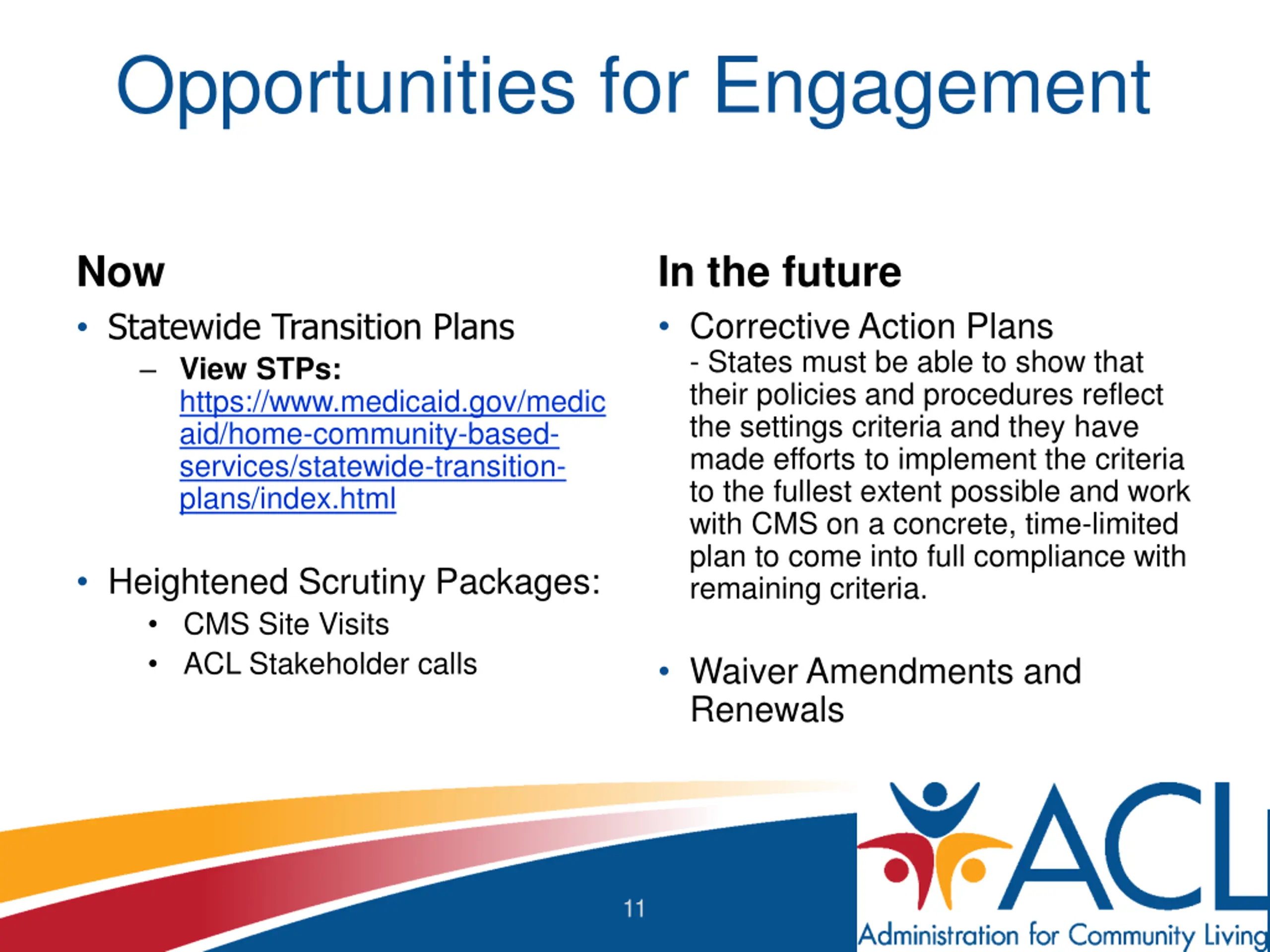 Importance of Public Engagement ACL works closely with CMS to implement the Settings Rule The Rule is a key to engaging community members in the development, provision, and oversight of HCBS programs. For the first time, ACL is specifically funding public engagement efforts. 10