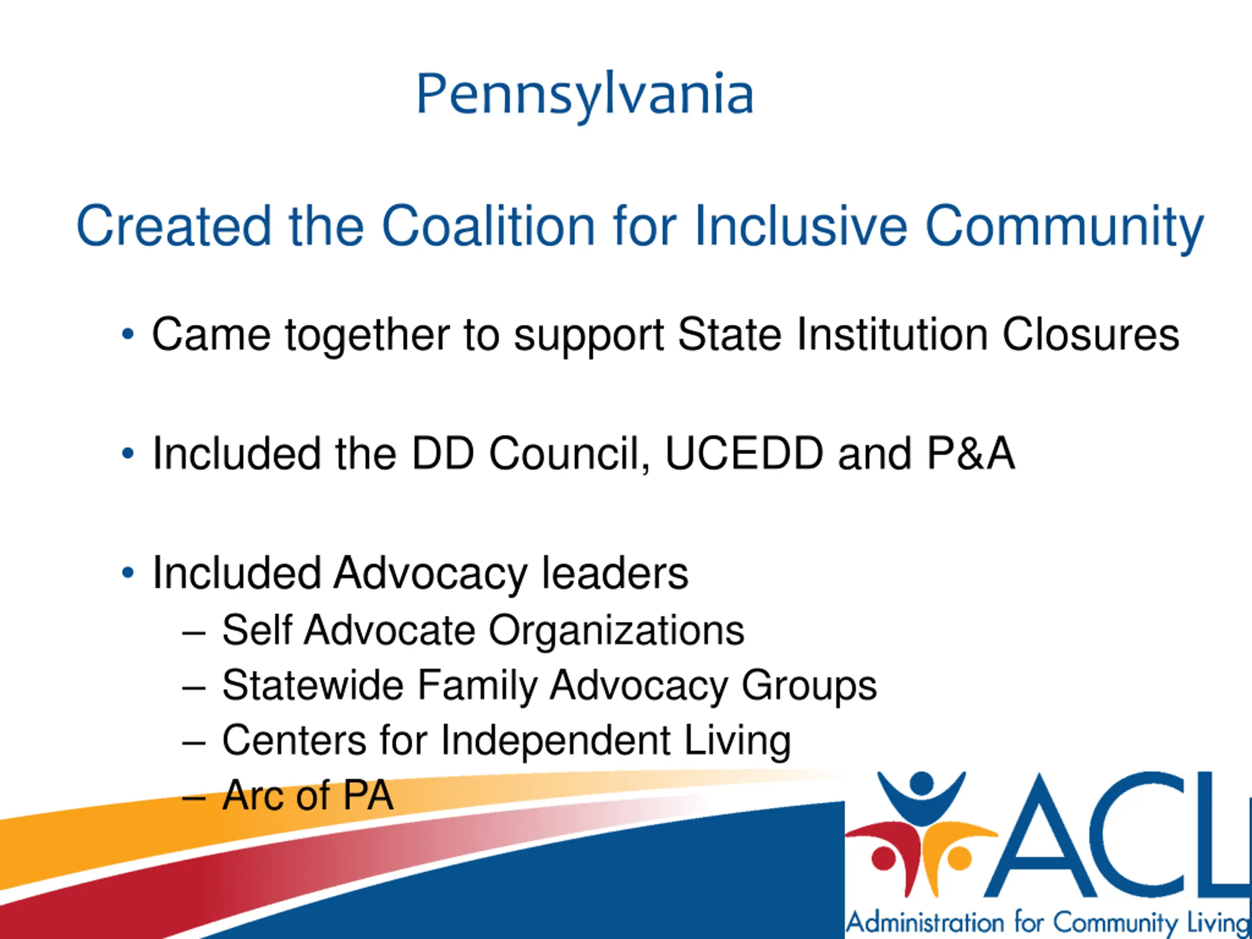 Pennsylvania Created the Coalition for Inclusive Community Came together to support State Institution Closures Included the DD Council, UCEDD and P&A Included Advocacy leaders Self Advocate Organizations Statewide Family Advocacy Groups Centers for Independent Living Arc of PA