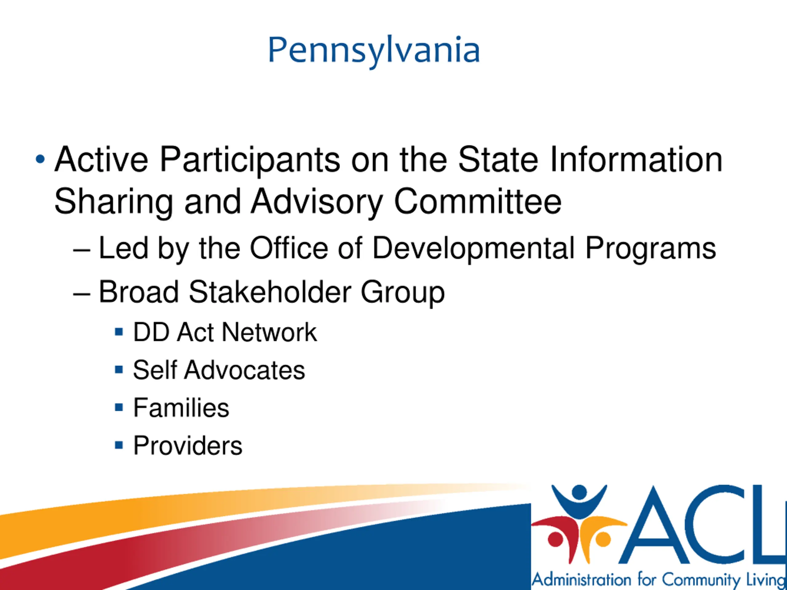 Pennsylvania Active Participants on the State Information Sharing and Advisory Committee Led by the Office of Developmental Programs Broad Stakeholder Group DD Act Network Self Advocates Families Providers