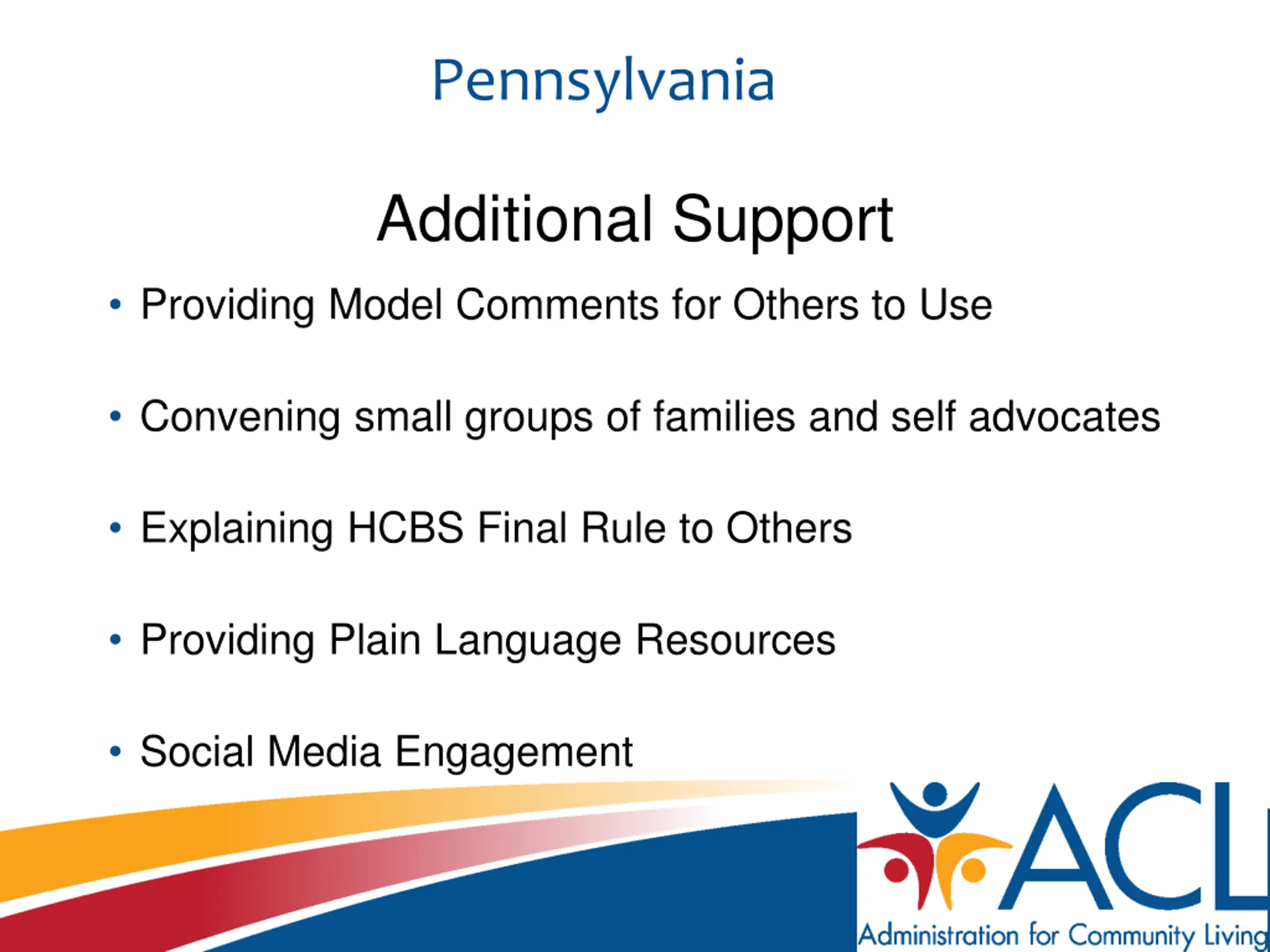 Pennsylvania Additional Support Providing Model Comments for Others to Use Convening small groups of families and self advocates Explaining HCBS Final Rule to Others Providing Plain Language Resources Social Media Engagement