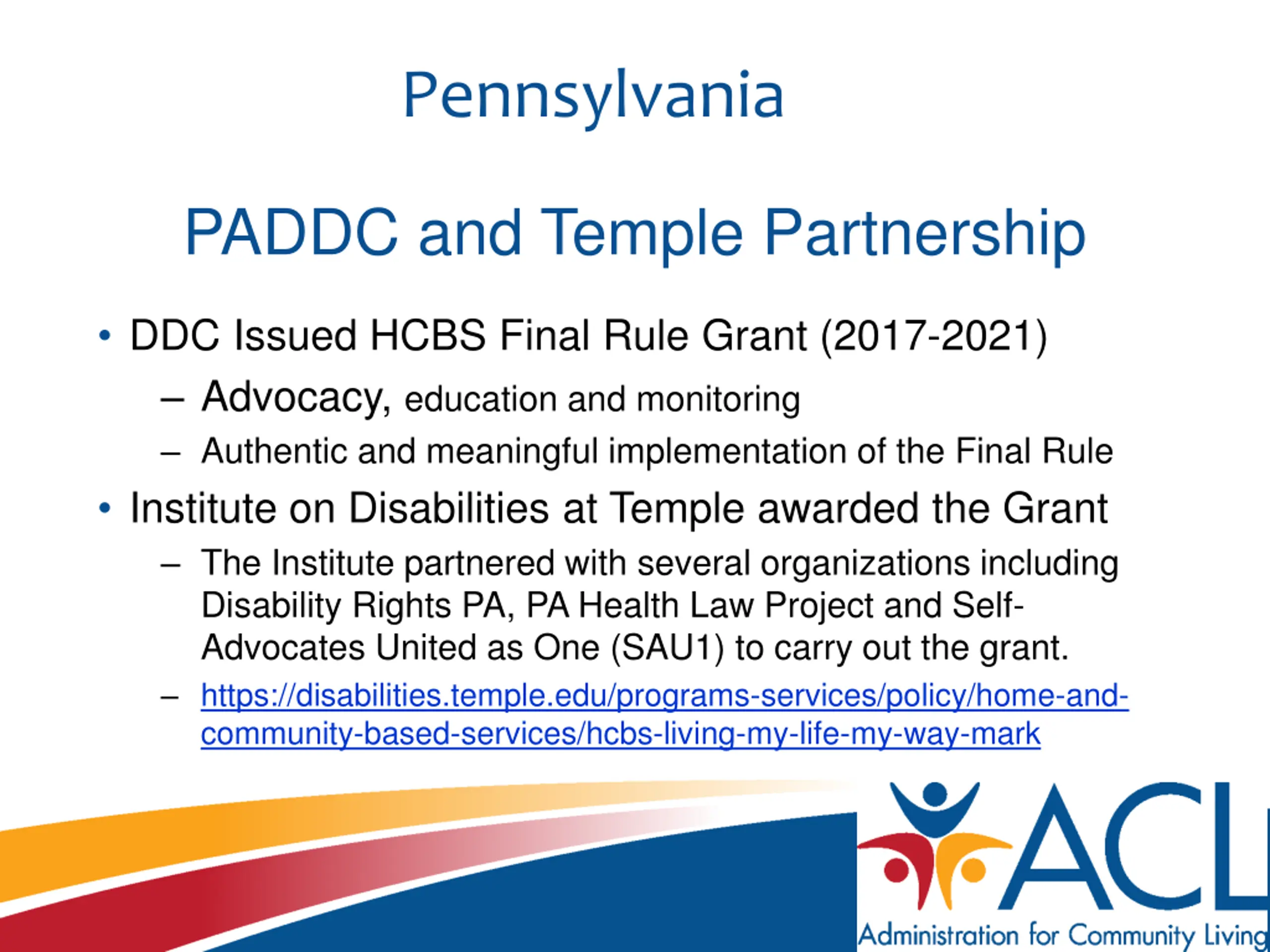 Pennsylvania PADDC and Temple Partnership DDC Issued HCBS Final Rule Grant (2017-2021) Advocacy, education and monitoring Authentic and meaningful implementation of the Final Rule Institute on Disabilities at Temple awarded the Grant The Institute partnered with several organizations including Disability Rights PA, PA Health Law Project and Self- Advocates United as One (SAU1) to carry out the grant. https://disabilities.temple.edu/programs-services/policy/home-and- community-based-services/hcbs-living-my-life-my-way-mark