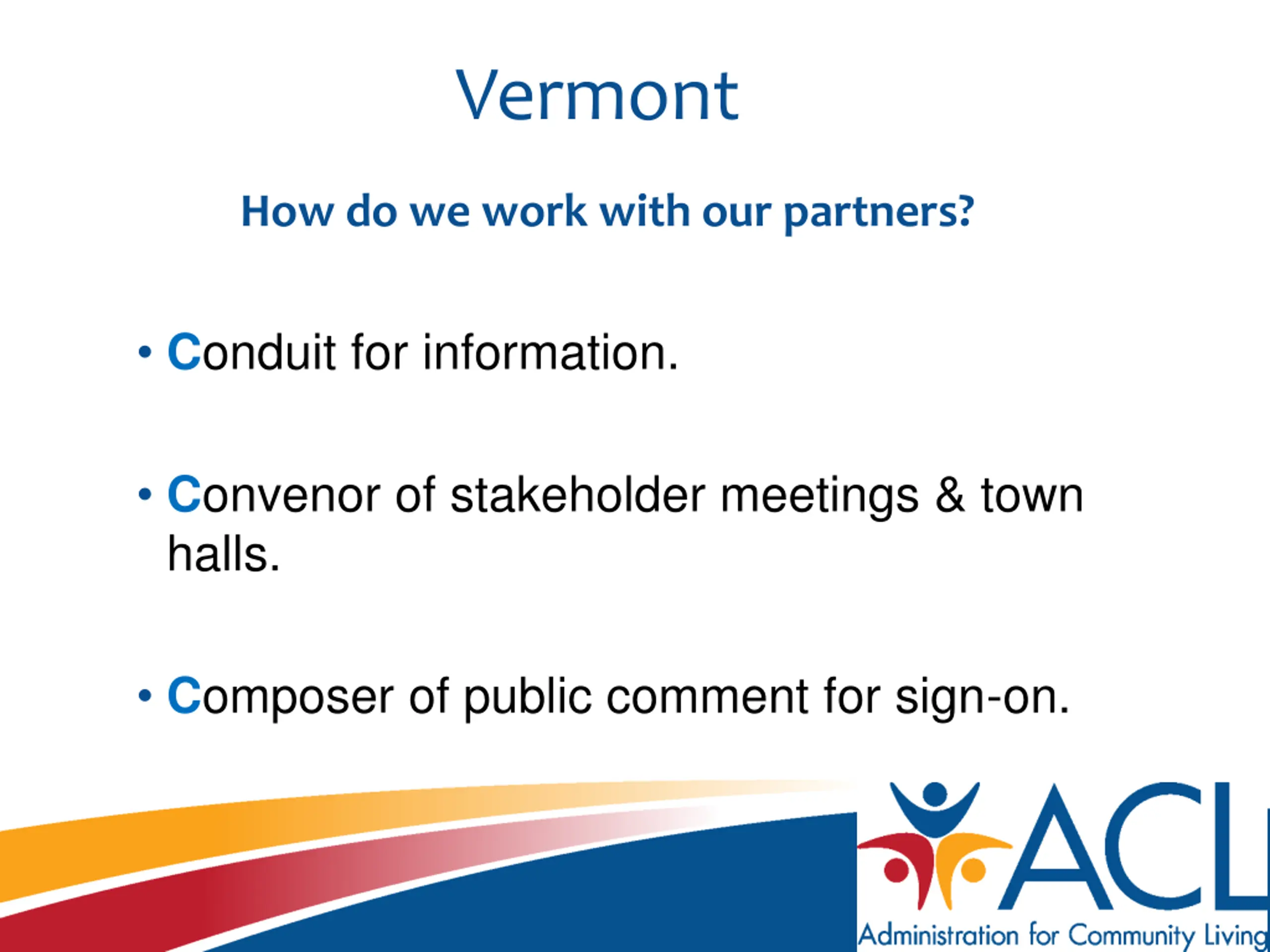 Vermont How do we work with our partners? Conduit for information. Convenor of stakeholder meetings & town halls. Composer of public comment for sign-on.