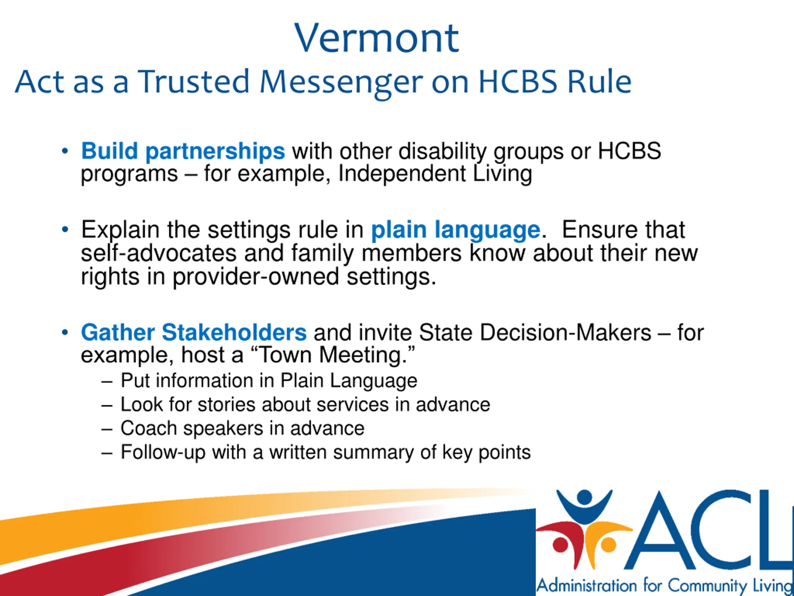 Vermont Act as a Trusted Messenger on HCBS Rule Build partnerships with other disability groups or HCBS programs for example, Independent Living Explain the settings rule in plain language. Ensure that self-advocates and family members know about their new rights in provider-owned settings. Gather Stakeholders and invite State Decision-Makers for example, host a Town Meeting. Put information in Plain Language Look for stories about services in advance Coach speakers in advance Follow-up with a written summary of key points