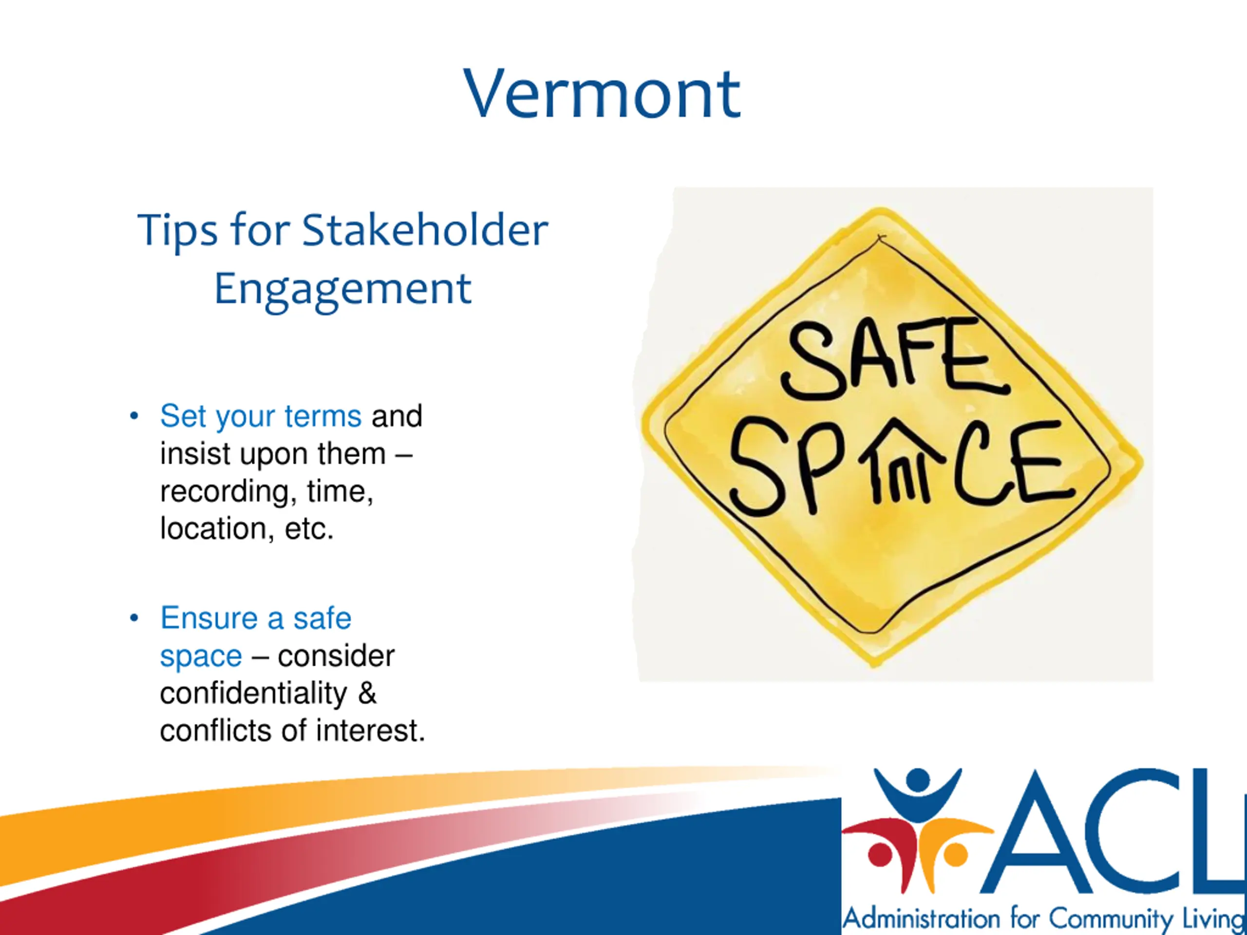 Vermont Tips for Stakeholder Engagement Set your terms and insist upon them recording, time, location, etc. Ensure a safe space consider confidentiality & conflicts of interest.