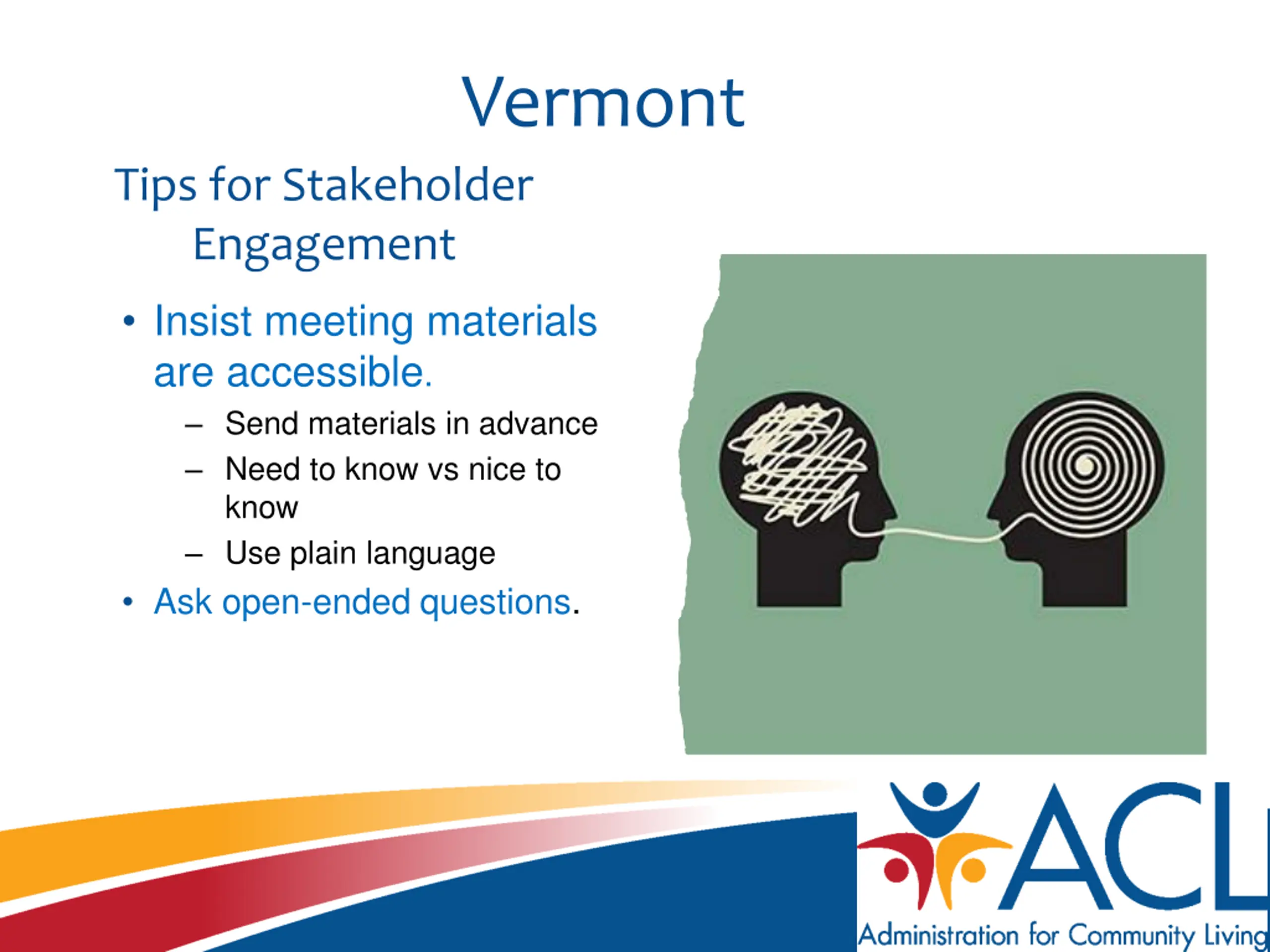 Vermont Tips for Stakeholder Engagement Insist meeting materials are accessible. Send materials in advance Need to know vs nice to know Use plain language Ask open-ended questions.