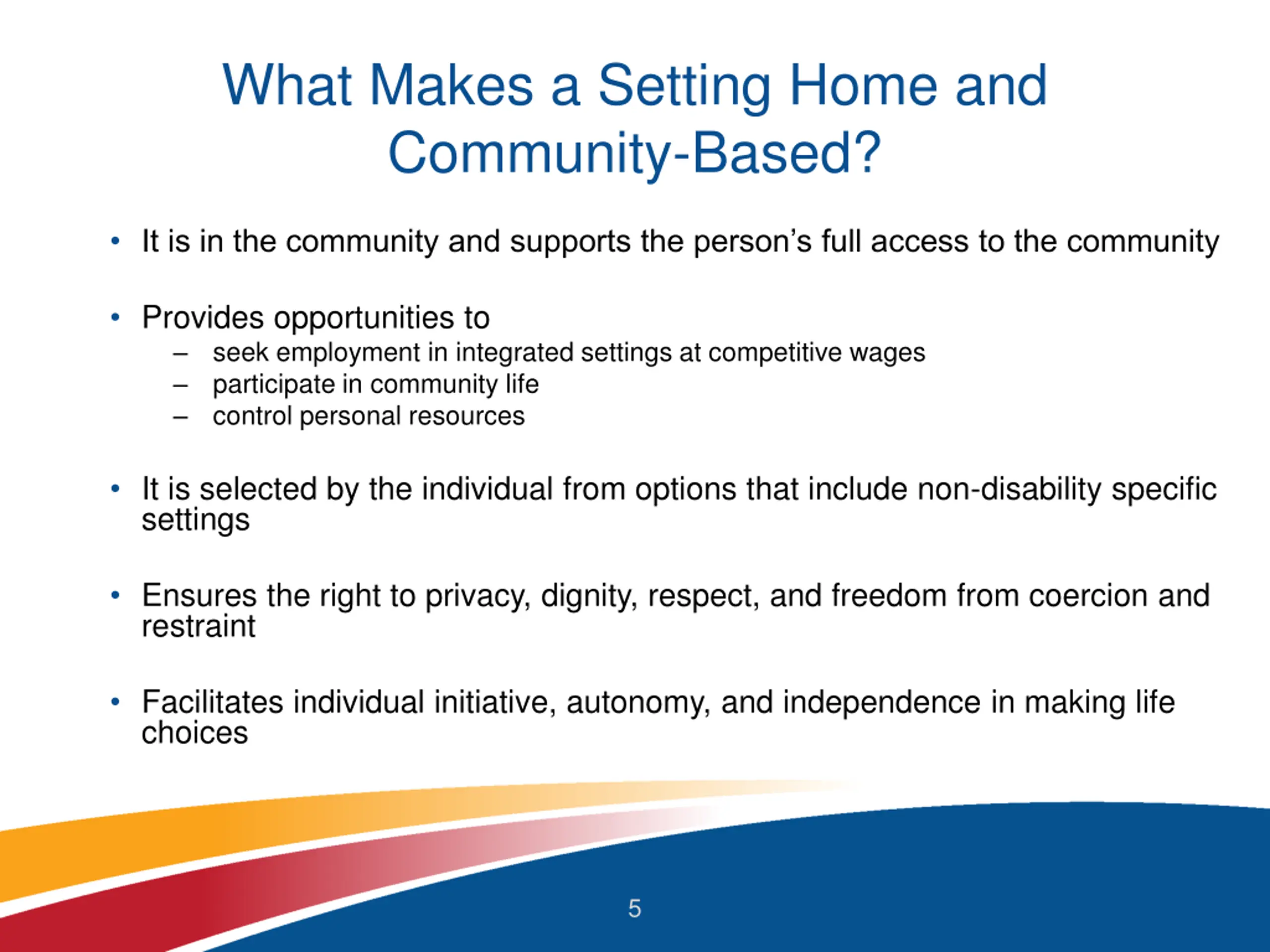 What Makes a Setting Home and Community-Based? It is in the community and supports the person s full access to the community Provides opportunities to seek employment in integrated settings at competitive wages participate in community life control personal resources It is selected by the individual from options that include non-disability specific settings Ensures the right to privacy, dignity, respect, and freedom from coercion and restraint Facilitates individual initiative, autonomy, and independence in making life choices 5