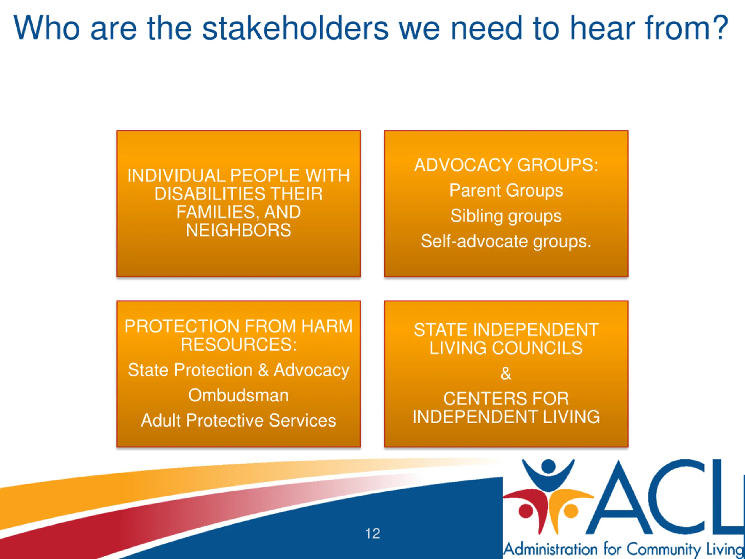 Who are the stakeholders we need to hear from? ADVOCACY GROUPS: Parent Groups Sibling groups Self-advocate groups. INDIVIDUAL PEOPLE WITH DISABILITIES THEIR FAMILIES, AND NEIGHBORS PROTECTION FROM HARM RESOURCES: State Protection & Advocacy Ombudsman Adult Protective Services STATE INDEPENDENT LIVING COUNCILS & CENTERS FOR INDEPENDENT LIVING 12
