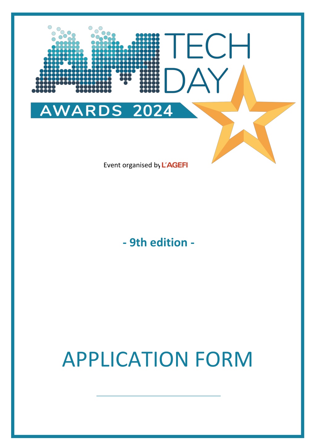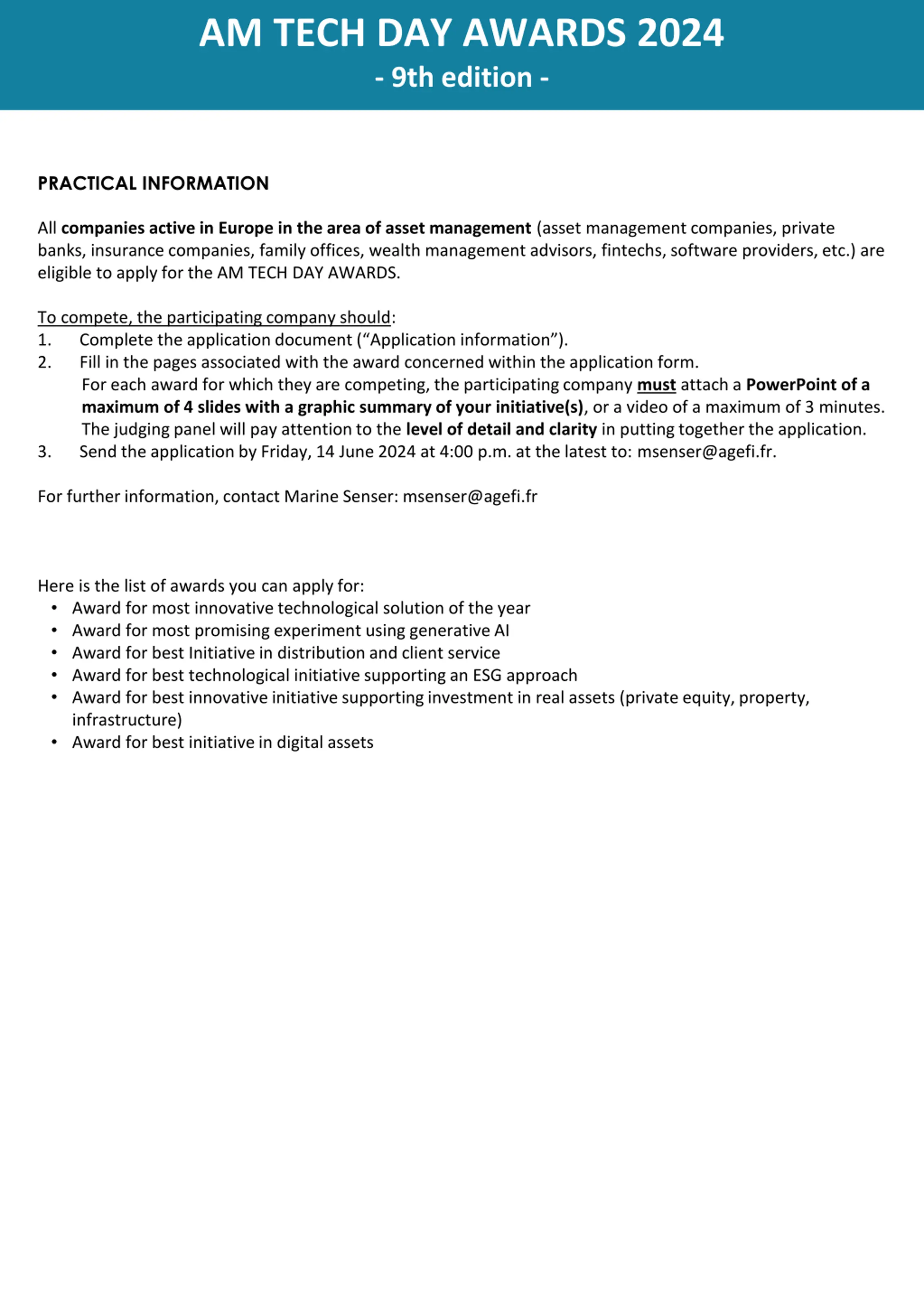 AM TECH DAY AWARDS 2024 - 9th edition - PRACTICAL INFORMATION All companies active in Europe in the area of asset management (asset management companies, private banks, insurance companies, family offices, wealth management advisors, fintechs, software providers, etc.) are eligible to apply for the AM TECH DAY AWARDS. To compete, the participating company should: 1. Complete the application document ( Application information ). 2. Fill in the pages associated with the award concerned within the application form. For each award for which they are competing, the participating company must attach a PowerPoint of a maximum of 4 slides with a graphic summary of your initiative(s), or a video of a maximum of 3 minutes. The judging panel will pay attention to the level of detail and clarity in putting together the application. 3. Send the application by Friday, 14 June 2024 at 4:00 p.m. at the latest to: msenser@agefi.fr. For further information, contact Marine Senser: msenser@agefi.fr Here is the list of awards you can applyfor: Award for most innovative technological solution of the year Award for most promising experiment using generative AI Award for best Initiative in distribution and client service Award for best technological initiative supporting an ESG approach Award for best innovative initiative supporting investment in real assets (private equity, property, infrastructure) Award for best initiative in digital assets