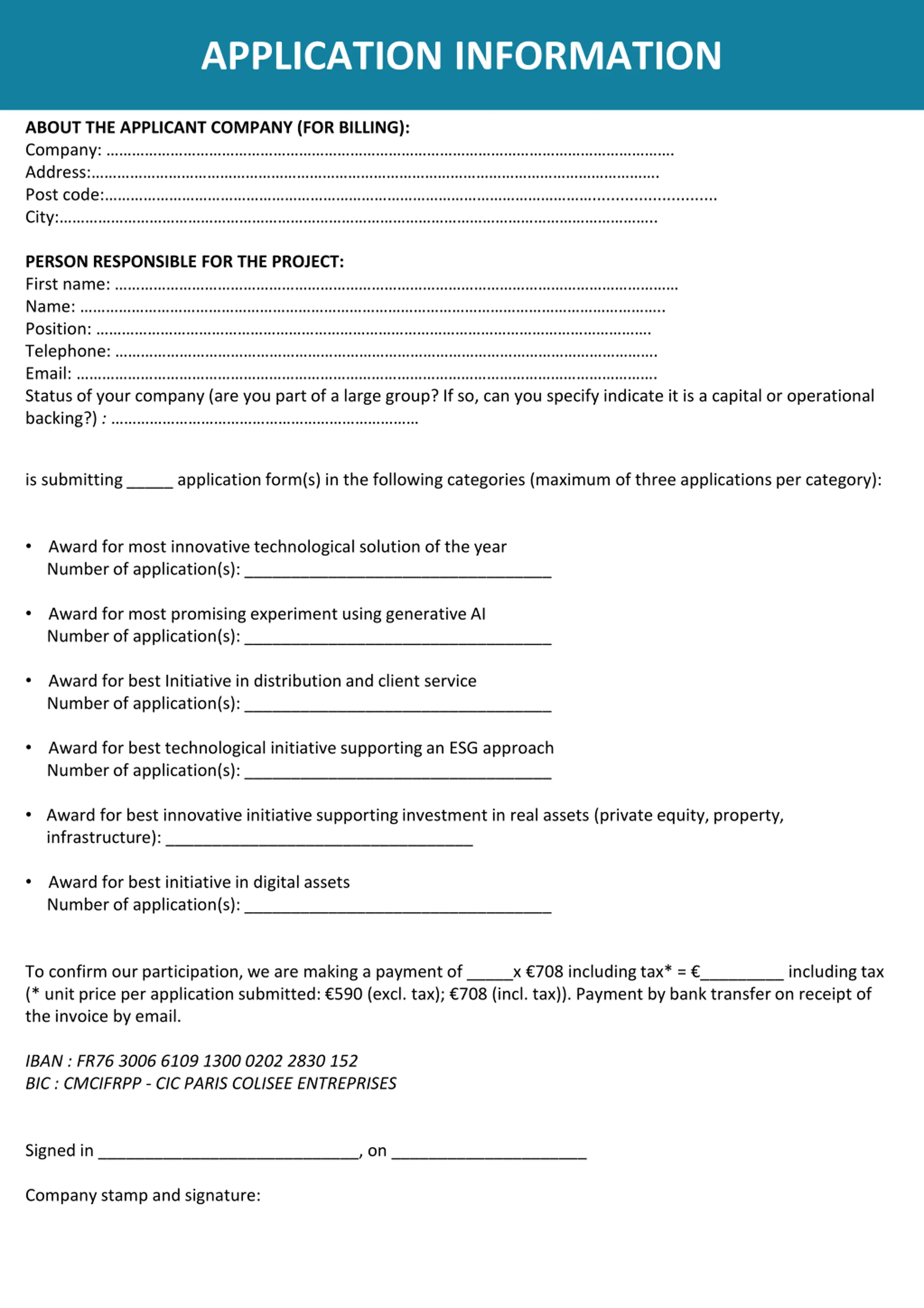 APPLICATION INFORMATION ABOUT THE APPLICANT COMPANY (FOR BILLING): Company: . Address: . Post code: ........................... City: .. PERSON RESPONSIBLE FOR THE PROJECT: First name: Name: .. Position: . Telephone: . Email: . Status of your company (are you part of a large group? If so, can you specify indicate it is a capital or operational backing?) : is submitting _____ application form(s) in the following categories (maximum of three applications per category): Award for most innovative technological solution of the year Number of application(s): _________________________________ Award for most promising experiment using generative AI Number of application(s): _________________________________ Award for best Initiative in distribution and client service Number of application(s): _________________________________ Award for best technological initiative supporting an ESG approach Number of application(s): _________________________________ Award for best innovative initiative supporting investment in real assets (private equity, property, infrastructure): _________________________________ Award for best initiative in digital assets Number of application(s): _________________________________ To confirm our participation, we are making a payment of _____x 708 including tax* = _________ including tax (* unit price per application submitted: 590 (excl. tax); 708 (incl. tax)). Payment by bank transfer on receipt of the invoice by email. IBAN : FR76 3006 6109 1300 0202 2830 152 BIC : CMCIFRPP - CIC PARIS COLISEE ENTREPRISES Signed in ____________________________, on _____________________ Company stamp and signature: