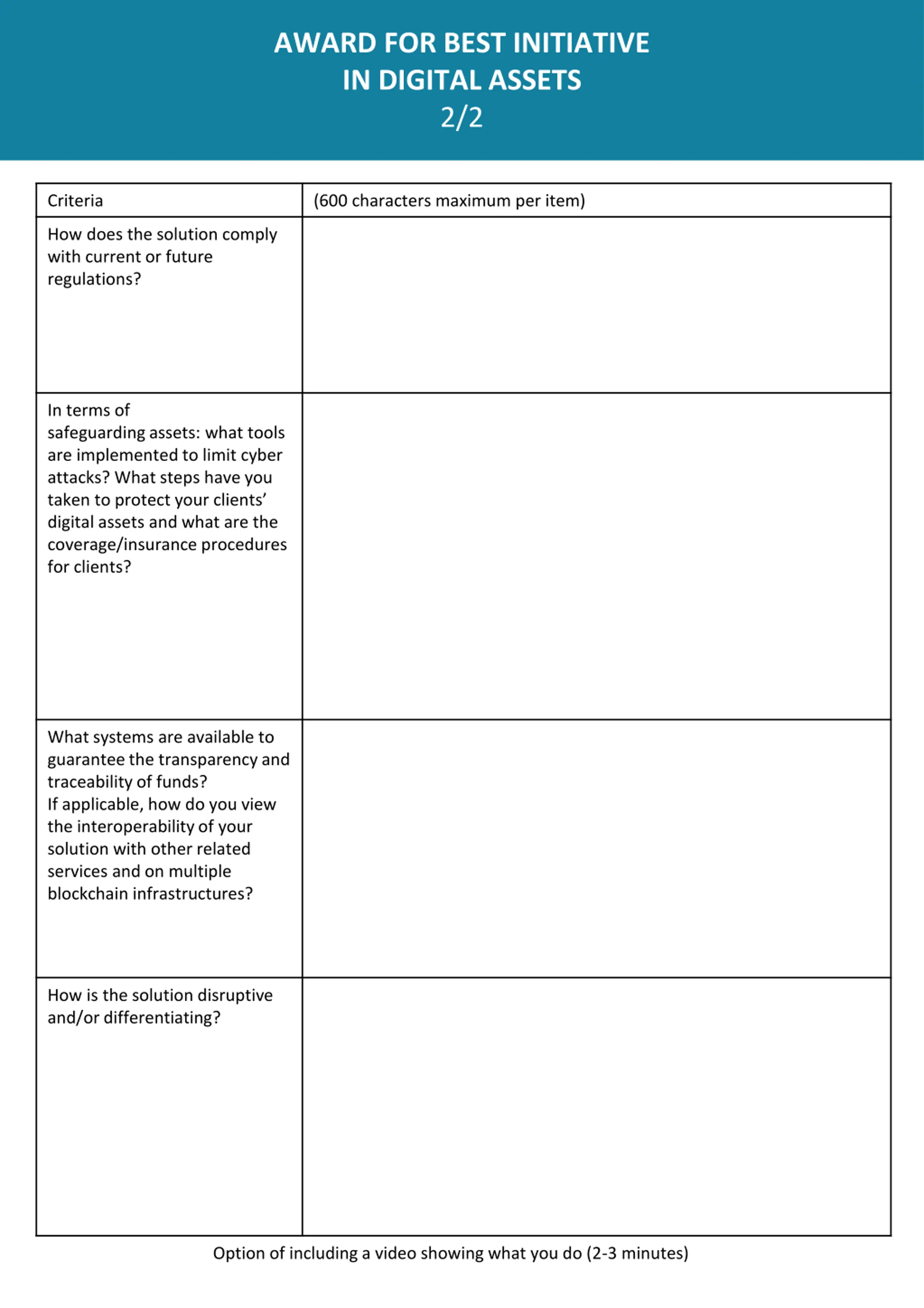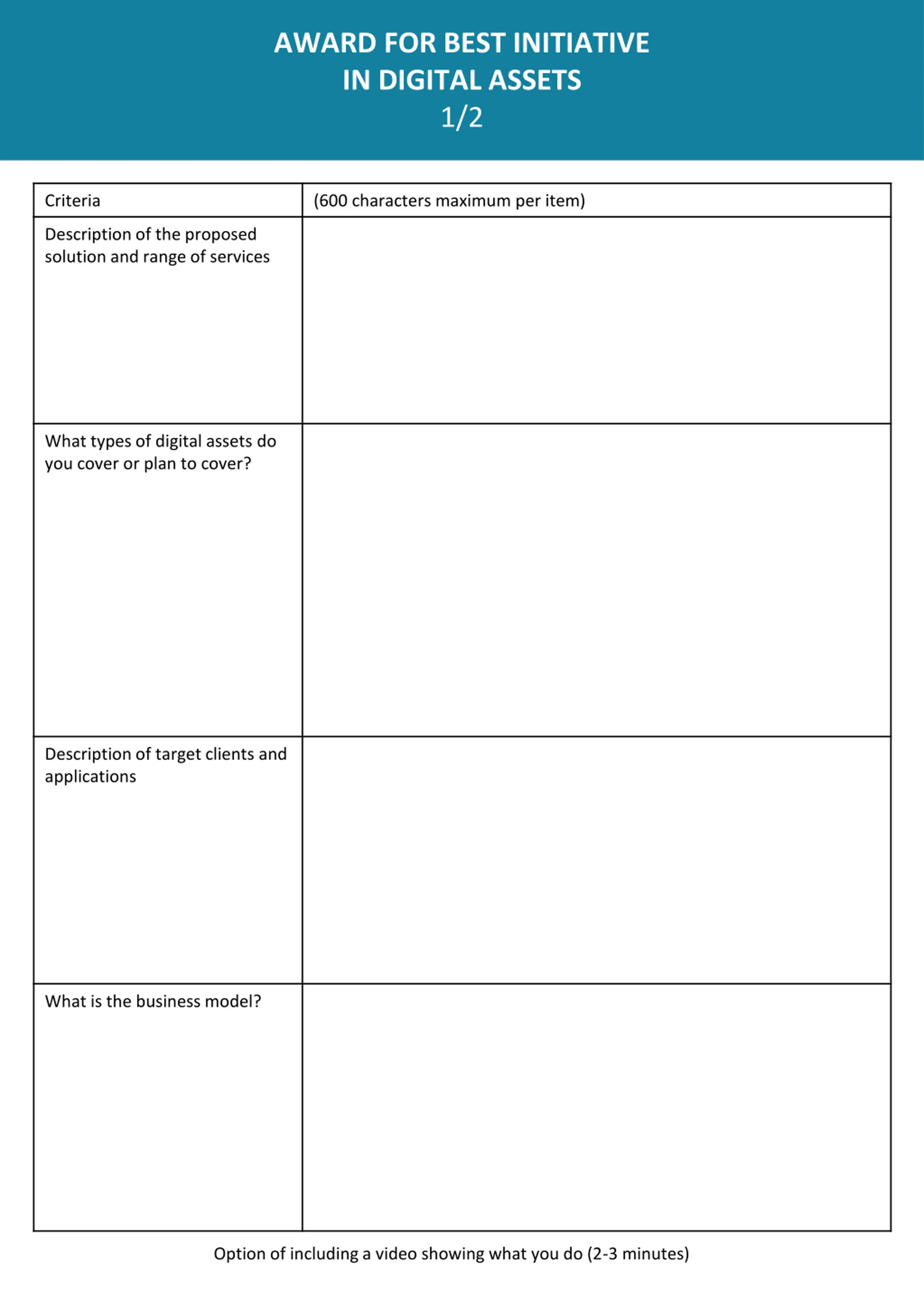 AWARD FOR BEST INITIATIVE IN DIGITAL ASSETS 1/2 Criteria (600 characters maximum per item) Description of the proposed solution and range of services What types of digital assets do you cover or plan to cover? Description of target clients and applications What is the business model? Option of including a video showing what you do (2-3 minutes)